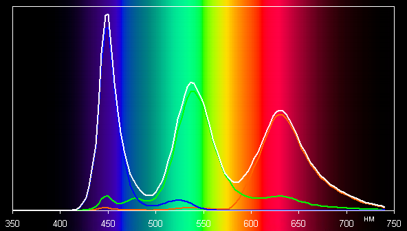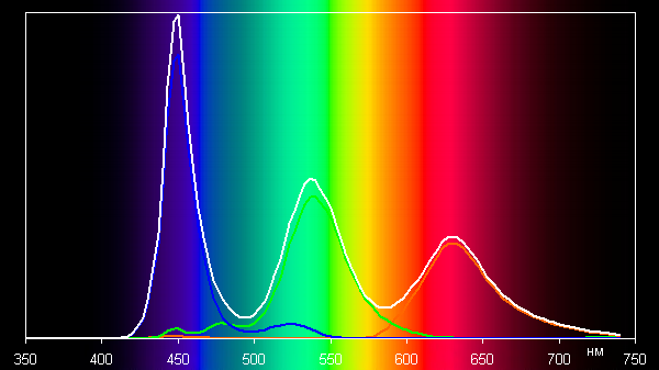 Ниже приведен спектр для белого поля (белая линия), наложенный на спектры красного, зеленого и синего полей (линии соответствующих цветов) для профиля Исходный: