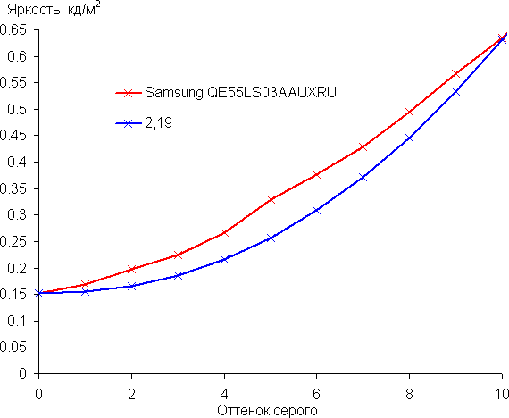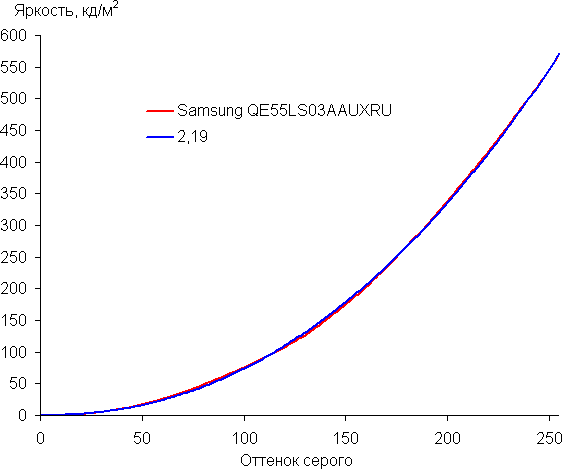 Аппроксимация полученной гамма-кривой дала показатель 2,19 что близко к стандартному значению 2,2. При этом реальная гамма-кривая немного отклоняется от аппроксимирующей степенной функции: