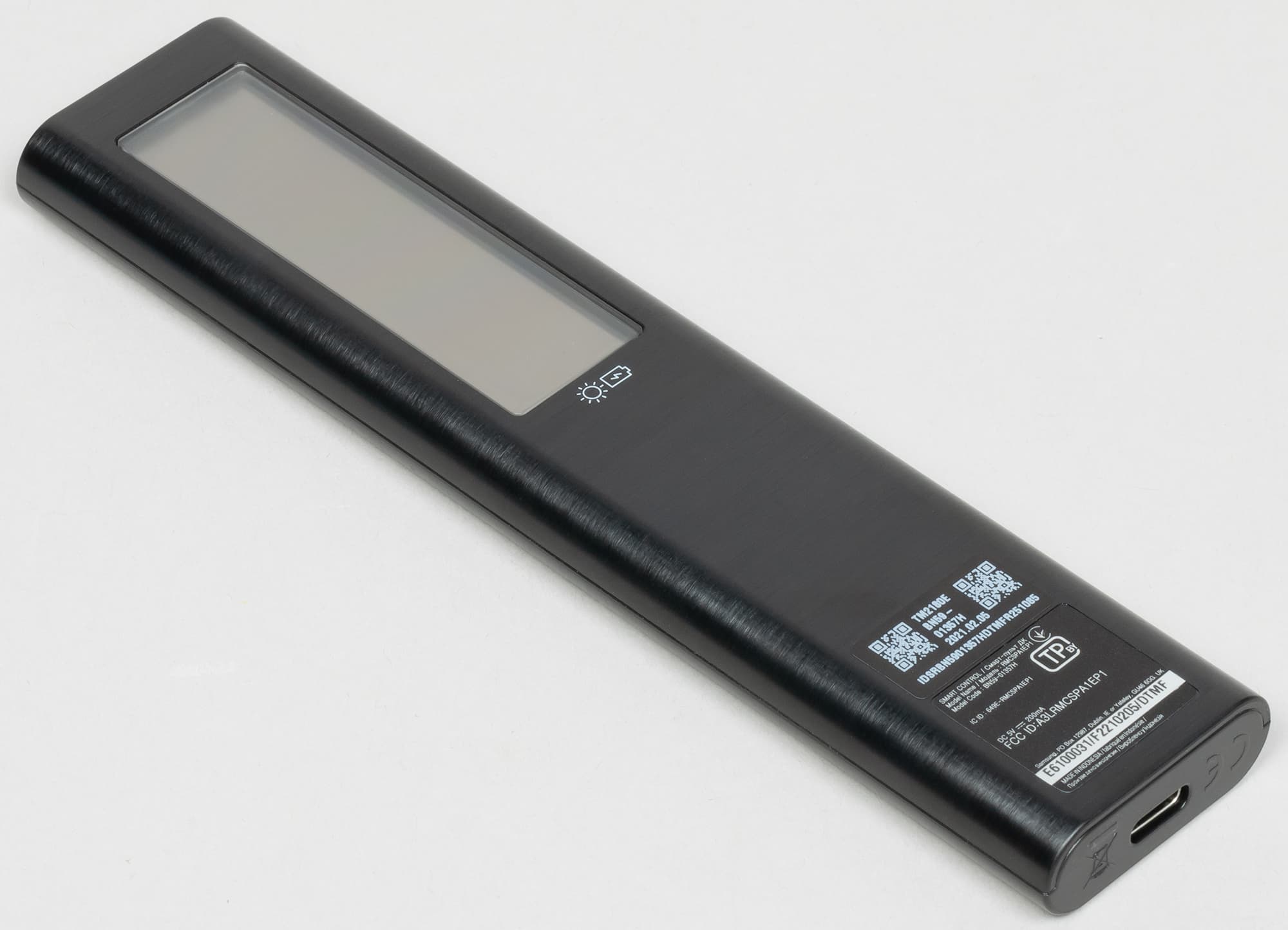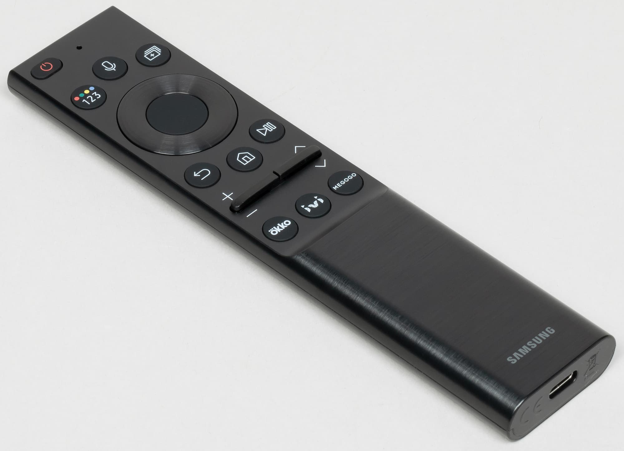 Пульт имеет типичный для топовых ТВ Samsung внешний вид. Пульт небольшой (161×36×13 мм) и легкий (59 г). Особенностью этого пульта является работа от встроенного аккумулятора, который заряжается от солнечной батареи (класть на солнце не обязательно, достаточно и искусственного освещения) или от порта USB-С на ближнем к пользователю торце.