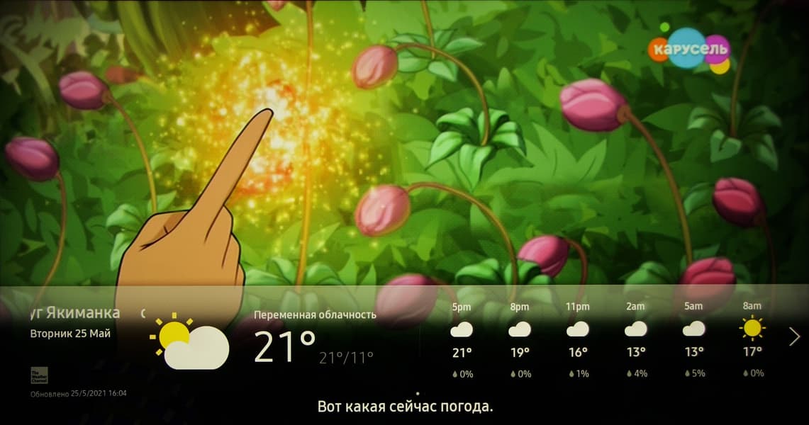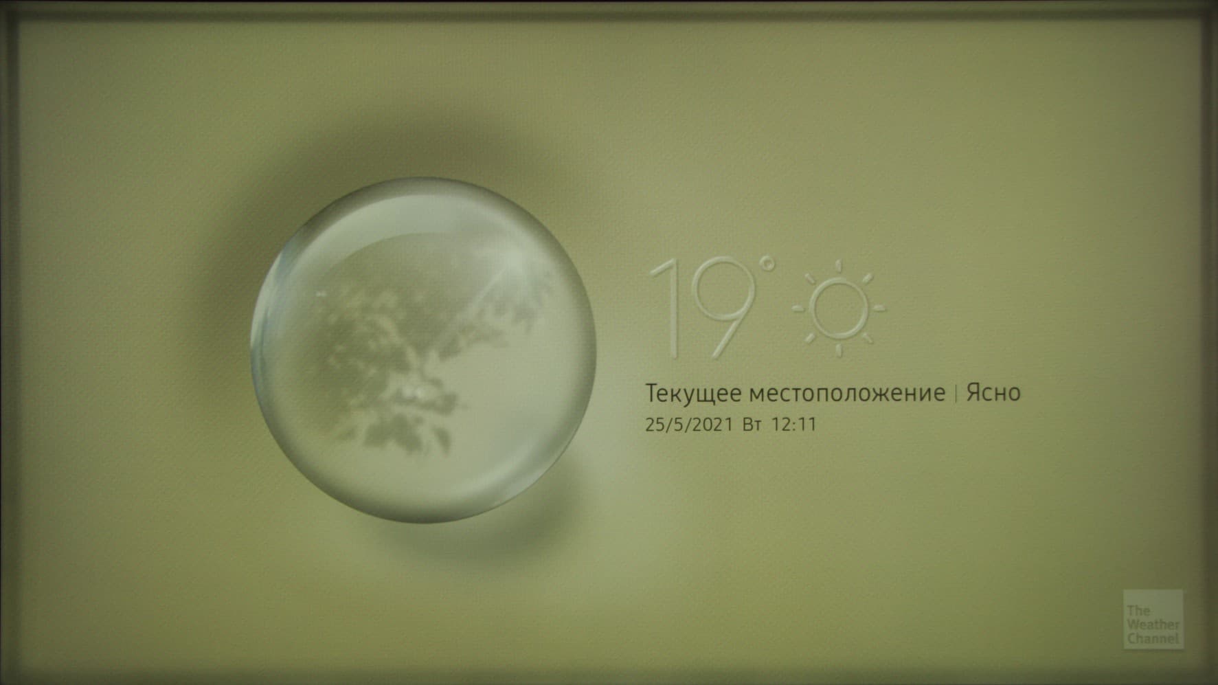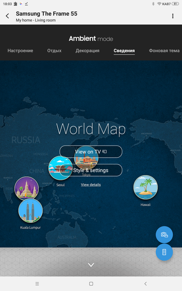 Специальный режим Ambient предназначен для демонстрации заставки на условно выключенном телевизоре. В этот режим работающий телевизор переключается или из главного меню, или из приложения SmartThings, или голосовой командой. Видов заставок несколько. В основном это какое-то изображение, на котором что-то меняется, зачастую есть и звуковое сопровождение. Также присутствуют две заставки с часами и метеорологическими данными, заставка с картой, на которой пользователь может отметить столицы стран, где он побывал, есть и просто варианты фоновой заливки с текстурами.