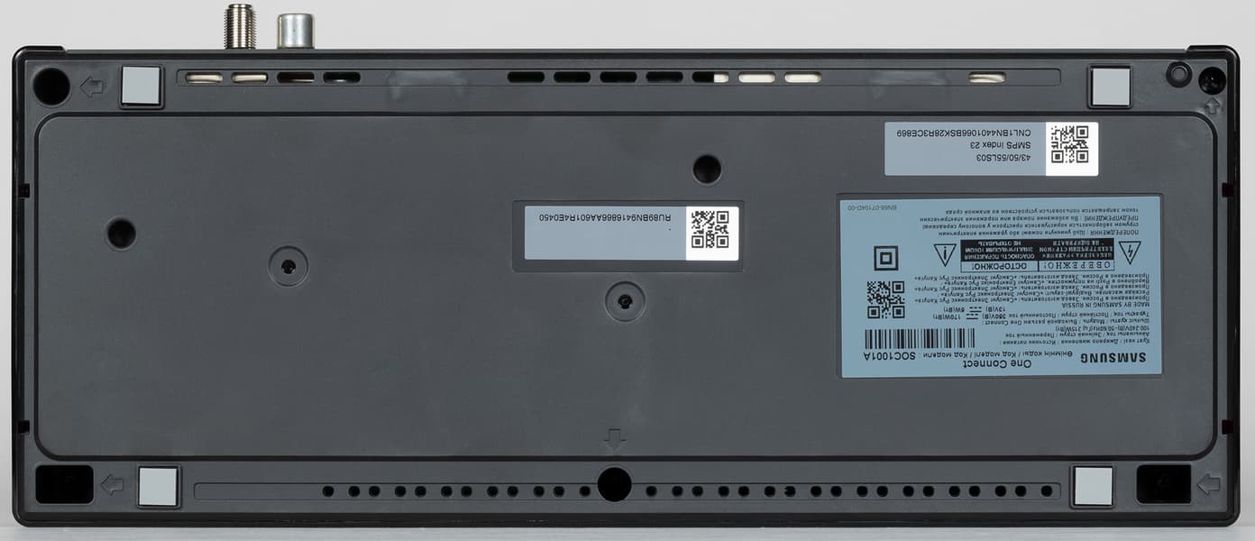 Корпус модуля One Connect изготовлен из пластика. Верхняя часть корпуса — это прозрачный, но плотно тонированный пластик, поэтому при обычном освещении он выглядит черным. Передняя панель — зеркально гладкая, а боковые, верхняя и задняя панели полуматовые. Днище модуля изготовлено из черного пластика снаружи с матовой поверхностью.