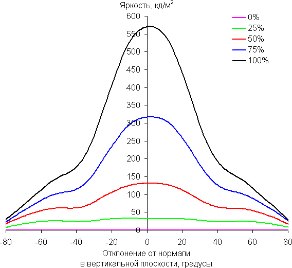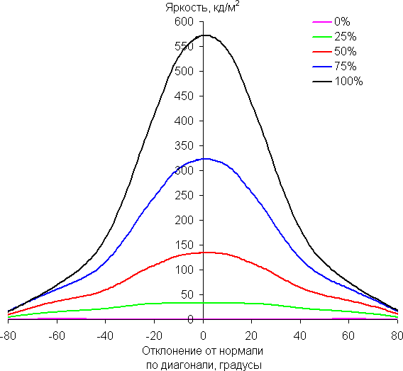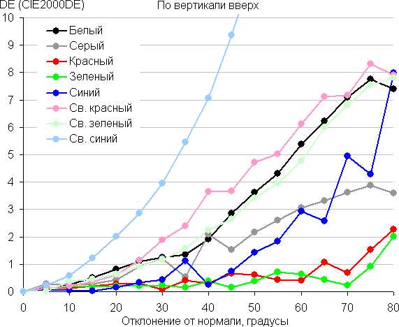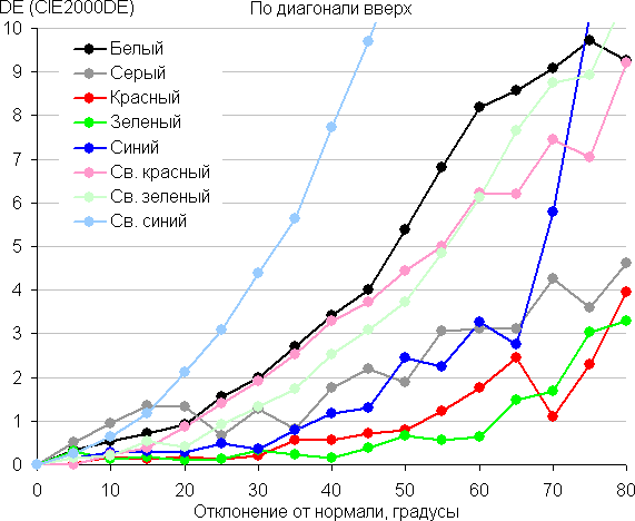 В качестве реперной точки можно выбрать отклонение в 45°. Критерием сохранения правильности цветов можно считать значение ΔE меньше 3. Из графиков следует, что при взгляде под углом первичные цвета меняются несильно, но полутона изменяются существенно, что ожидаемо для матрицы типа VA* и является ее основным недостатком.