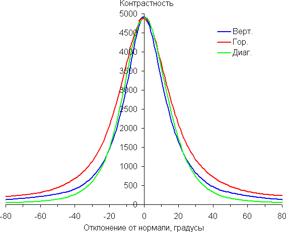 Отметим плавное, но все же относительно быстрое уменьшение яркости при небольшом отклонении от перпендикуляра к экрану во всех трех направлениях. Графики яркости полутонов не пересекаются во всем диапазоне измеряемых углов. Яркость черного поля при отклонении от перпендикуляра к экрану возрастает, но всего до примерно 0,14% максимум от максимальной яркости белого поля. Это хороший результат. Контрастность в диапазоне углов ±82° не опускается ниже отметки 10:1.