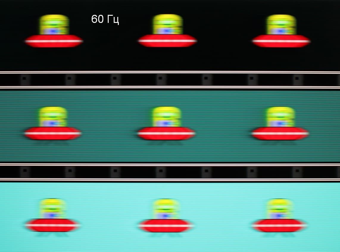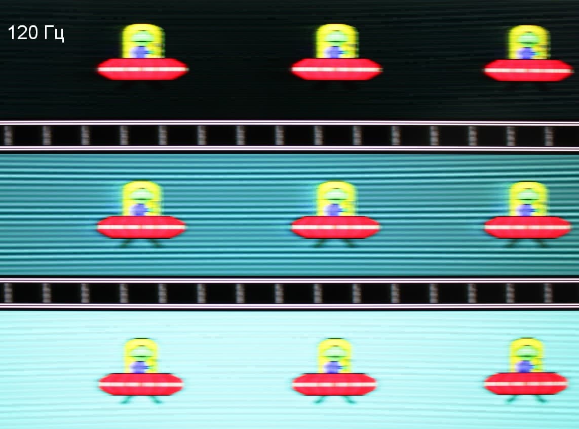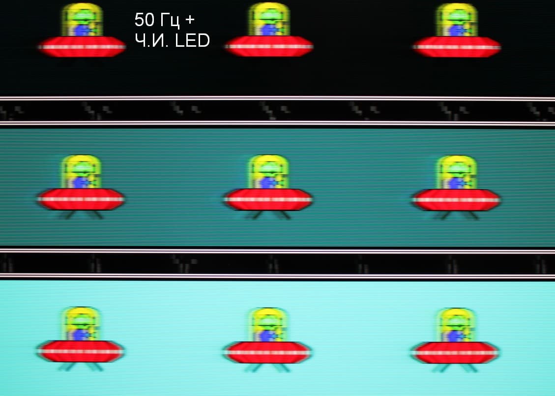 Видно, что при прочих равных условиях четкость изображения повышается по мере роста частоты обновления, а включение режима Ч.И. LED существенно повышает четкость, но и приводит к появлению неяркой тени позади летающей тарелки. При этом работает вставка промежуточных кадров, поэтому метки синхронизации ведут себя странно. С выключенным Ч.И. LED артефакты, вызванные разгоном — светлая кайма на темном фоне, — несущественные.