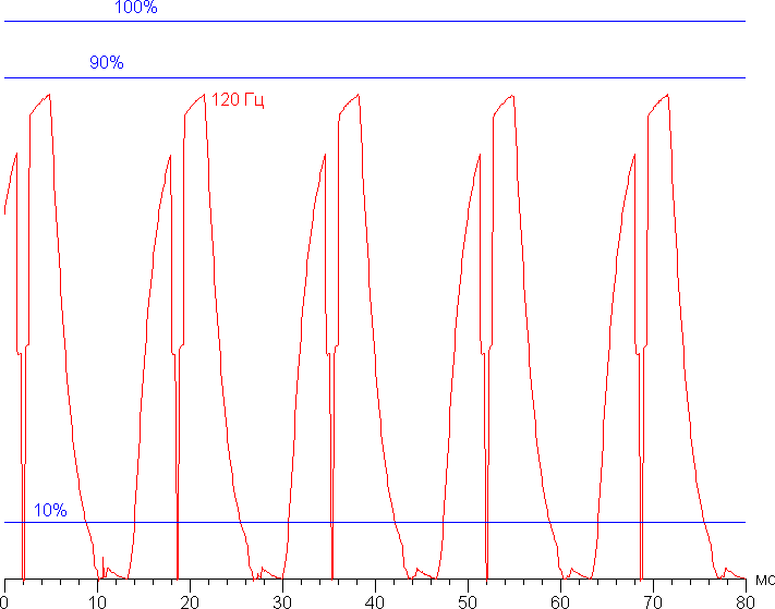 Скорости матрицы достаточно для полноценного вывода изображения с частотой 120 Гц. В подтверждение приведем зависимость яркости от времени при чередовании белого и черного поля при 120 Гц кадровой частоты (график с подписью 120 Гц):