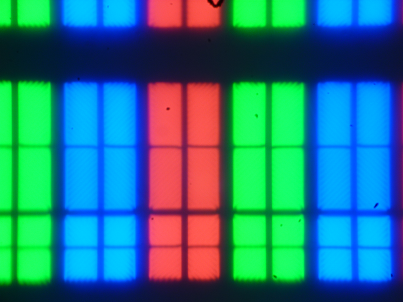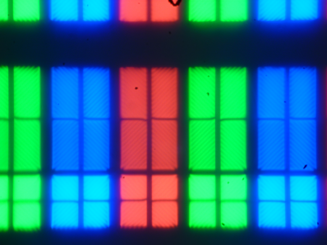 Субпиксели трех цветов (красного, зеленого и синего) поделены на две различающиеся по площади и независимо управляемые области, каждая из которых разделена на четыре участка с доменами в различающейся ориентации. Такое сложное устройство в принципе способно обеспечить широкий динамический диапазон по количеству оттенков, так как с ростом яркости области включаются последовательно, и хорошие углы обзора, чему способствует вариация ориентации ЖК в доменах. Отметим, что никакого «кристаллического эффекта» (микроскопической вариации яркости и оттенка) в данном случае нет.