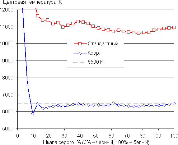 Самый близкий к черному диапазон можно не учитывать, так как в нем цветопередача не так важна, а погрешность измерения цветовых характеристик высокая. В случае самого яркого (и контрастного) варианта цветовая температура слишком высокая. Коррекция привела ее в норму, но яркость и контраст, разумеется, при этом снизились.