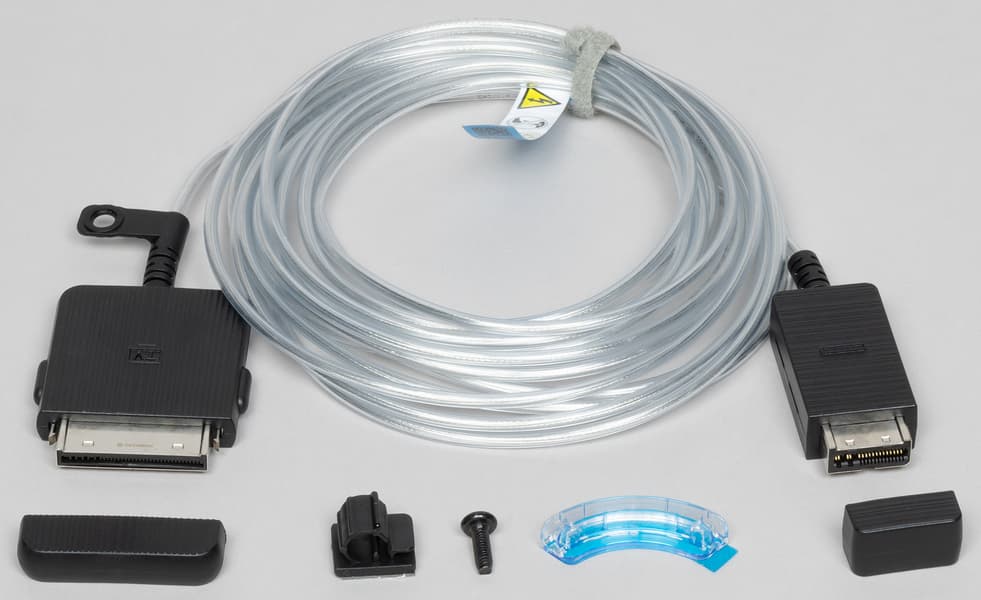 Напомним, что в нише на задней панели телевизора всего один разъем — для кабеля One Invisible Connection от модуля One Connect. От этого модуля на телевизор передаются как данные, так и питание, и все это по одному тонкому (диаметром 3,4 мм) и длинному (5 м) малозаметному кабелю с прозрачной оболочкой. Данные передаются по оптоволокну, а питание — по медным многопроволочным жилам. Разъемы на концах этого кабеля электрические, видимо, в них встроены оптические приемопередатчики.