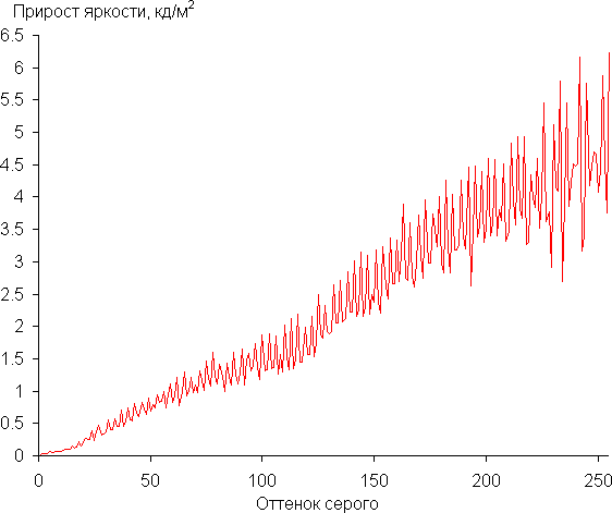 Для оценки характера роста яркости мы измерили яркость 256 оттенков серого (от 0, 0, 0 до 255, 255, 255) при подключении к ПК в режиме RGB при 3840×2160 и 60 Гц, параметр Гамма в настройках ТВ — 2.2, Контраст = 38. График ниже показывает прирост (не абсолютное значение!) яркости между соседними полутонами:
