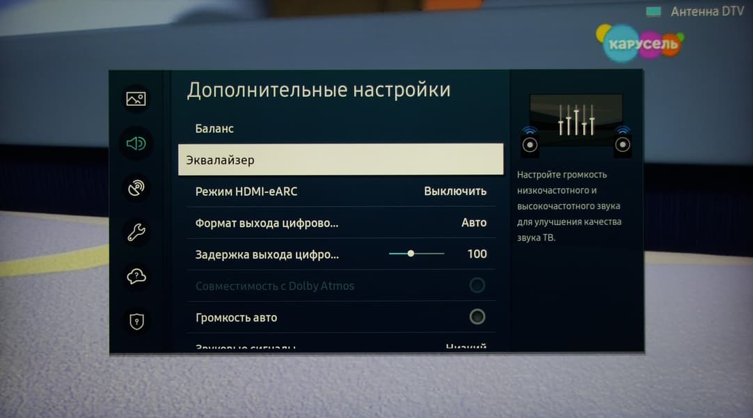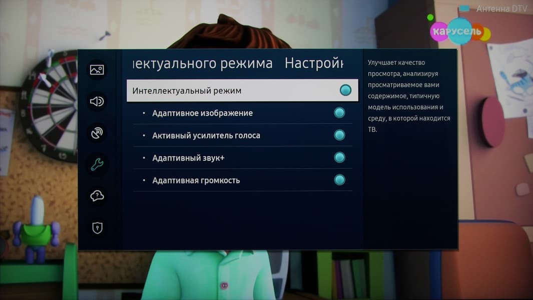 Отметим, что в этом ТВ есть функция, которая для автоматической настройки параметров звука и изображения использует данные, полученные с микрофона и с датчика освещенности.