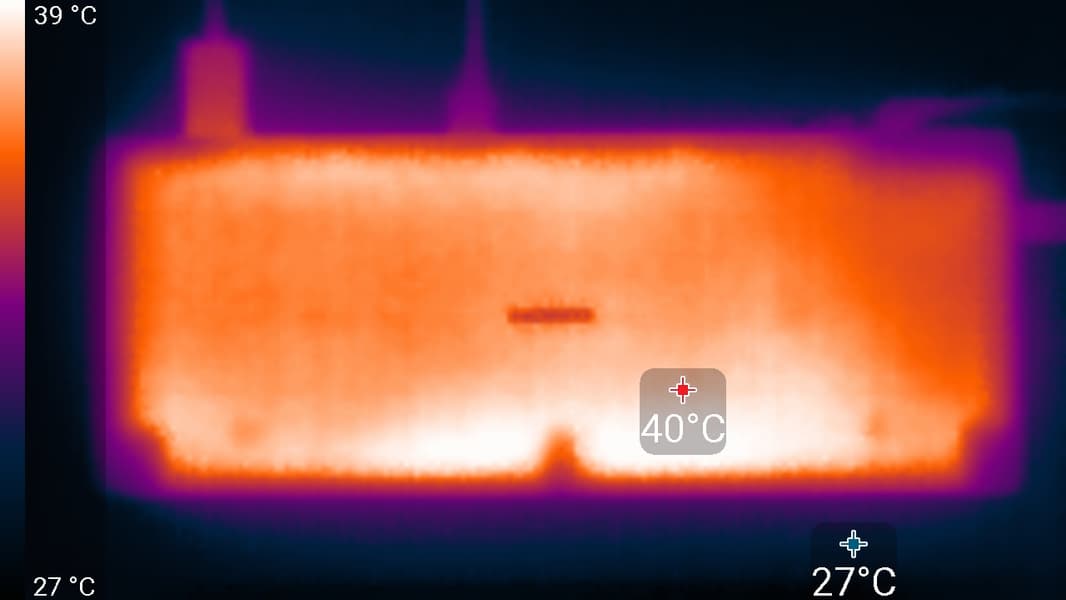 Видно, что нагрев не высокий и основным источником тепла является светодиодная линейка по нижнему краю экрана. Поверхность корпуса модуля One Connect нагревается умеренно, но все равно лучше располагать этот модуль в хорошо вентилируемом месте.
