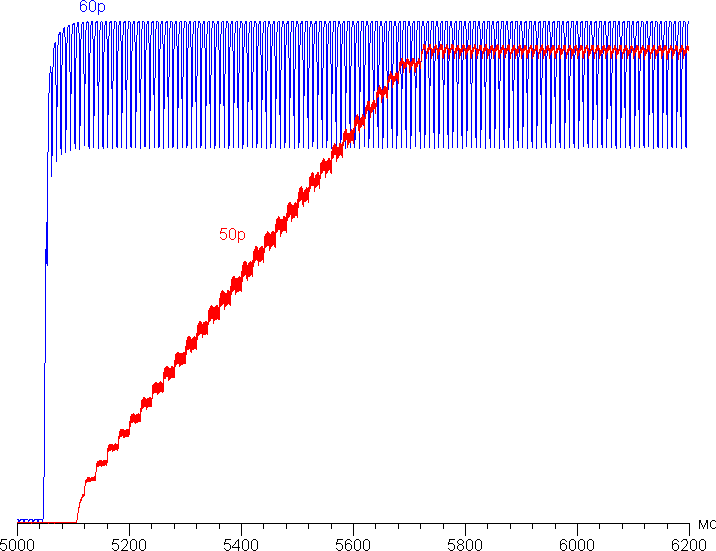 График ниже показывает, как меняется яркость (вертикальная ось) при переключении с черного поля на белое для случаев, когда динамическая подстройка яркости подсветки не работает (сигнал 60p при подключении к ПК) и работает (сигнал 50p):