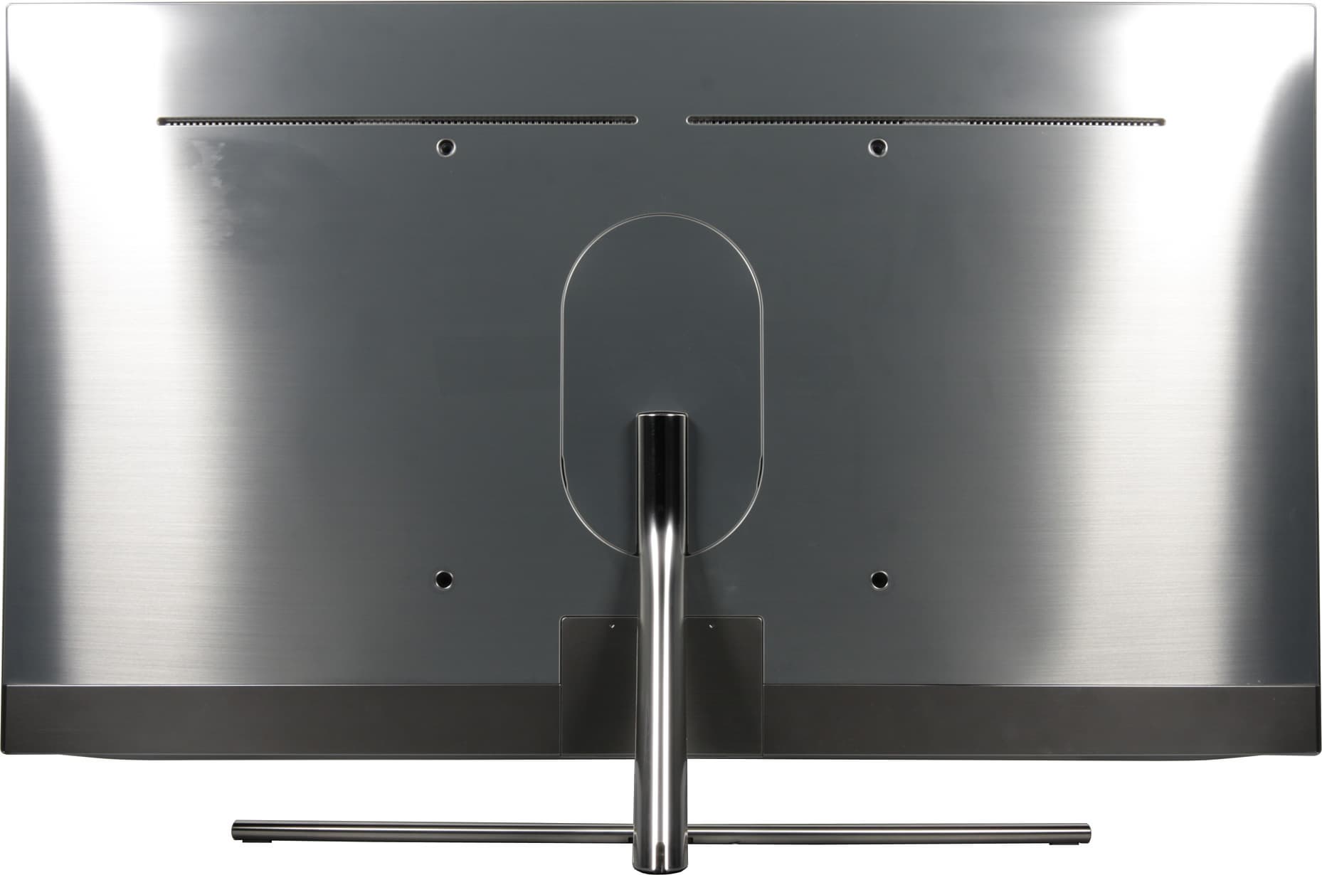 Альтернативный способ установки телевизора — это вариант крепления телевизора на VESA-кронштейне под имеющиеся на задней панели резьбовые отверстия. Из-за изгиба экрана придется использовать входящие в комплект поставки-адаптеры для крепления на стену. Также можно использовать фирменный кронштейн, обеспечивающий крепление на стене «практически без зазора». Большая часть кожуха задней панели изготовлена из алюминиевого листа с гладкой, но неполированной поверхностью. И только узкая вставка снизу — из пластика с серебристым покрытием.