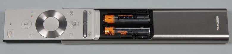 Извлечь их помогают кнопочки сбоку, нажатие на которые приподнимает торец элемента питания. Кнопок на пульте немного, их обозначения не очень контрастные. Часть из кнопок представляют собой слегка выступающие бугорки на верхней панели там, где она может прогибаться до замыкания контактов. Ход большинства кнопок короткий и умеренно тугой. Есть две кнопки-качельки изменения громкости и переключения ТВ-каналов. Нажатие на эти кнопки без отклонения выключает/включает звук и выводит ТВ-программу, соответственно. Подсветки нет. В передней части есть отверстие микрофона. Нажатие на кнопку с изображением микрофона приглушает звук телевизора и переводит его в состояние ожидания голосовой команды.