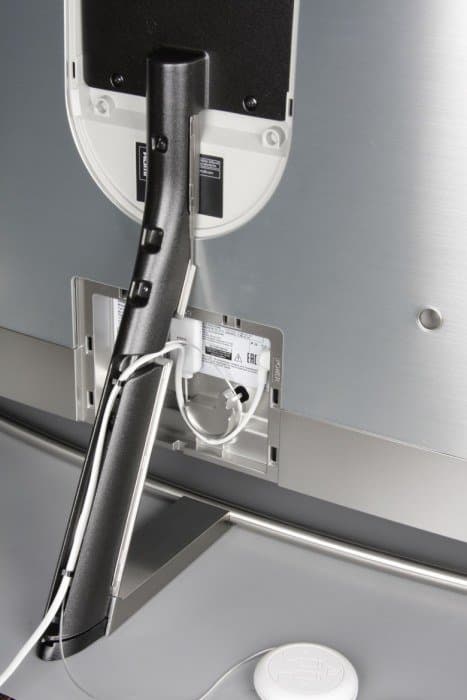 Место, где стойка прикручивается к блоку экрана, закрывается щитком из пластика. Щитком закрывается и ниша с двумя разъемами — питания и от модуля One Connect. При этом оба кабеля можно уложить в канал на стойке и прикрыть их декоративным щитком. Выходящие снизу кабели можно пустить за тумбу/стол, на которой стоит телевизор, в итоге получится очень аккуратно выглядящая со всех сторон инсталляция.