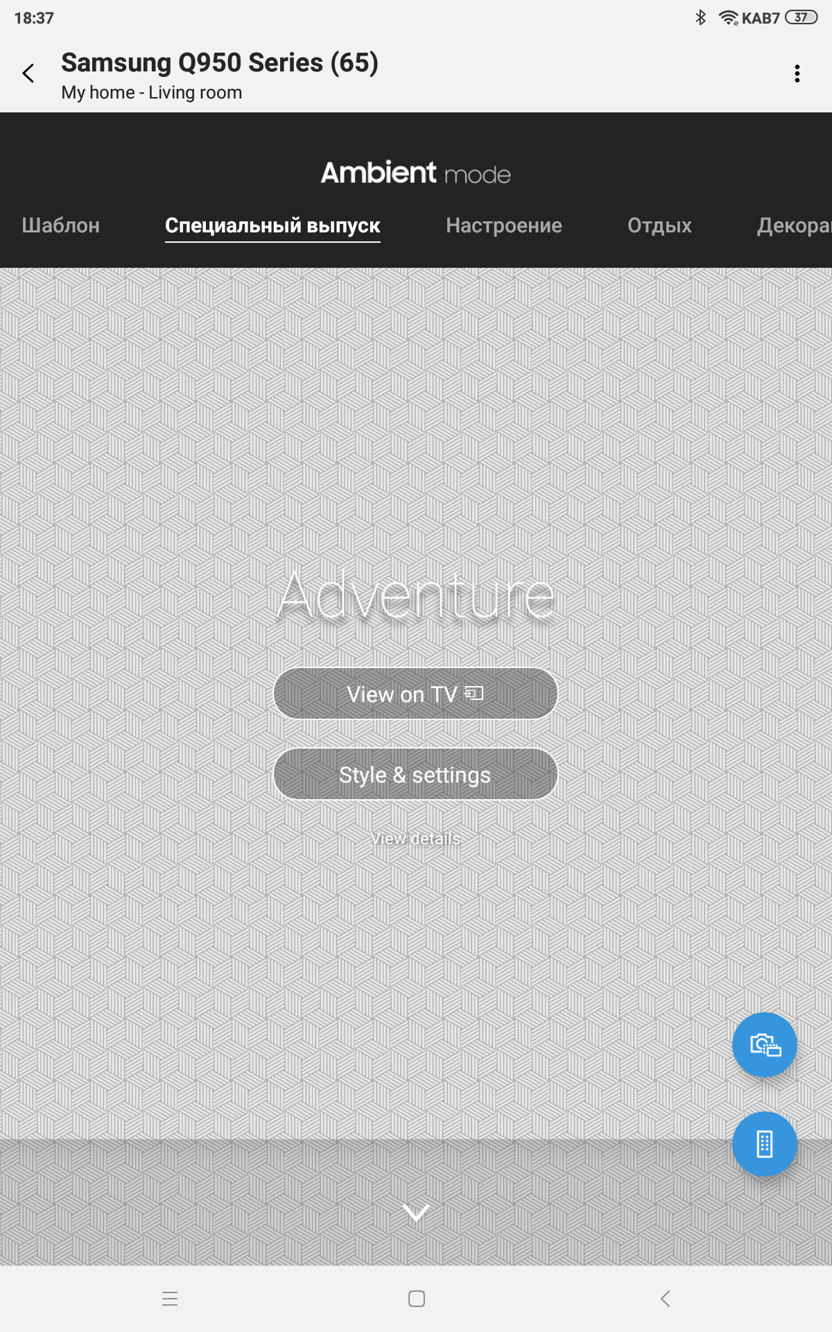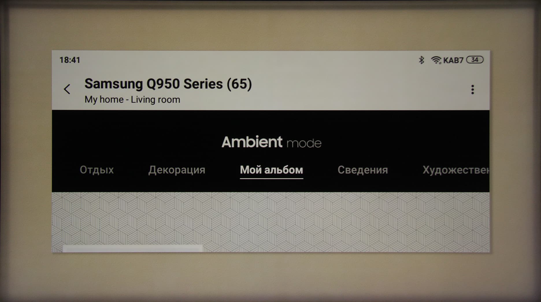 Специальный режим Ambient предназначен для демонстрации заставки на условно выключенном телевизоре. В этот режим работающий телевизор переключается при коротком нажатии на специальную кнопку на пульте, или из главного меню, или из приложения SmartThings, или голосовой командой.
