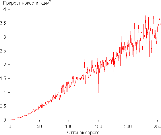 Для оценки характера роста яркости мы измерили яркость 256 оттенков серого (от 0, 0, 0 до 255, 255, 255) при подключении к ПК в режиме RGB при 3840×2160 и 60 Гц, параметр Гамма в настройках ТВ — BT.1886 = -2, Контраст = 50. График ниже показывает прирост (не абсолютное значение!) яркости между соседними полутонами: