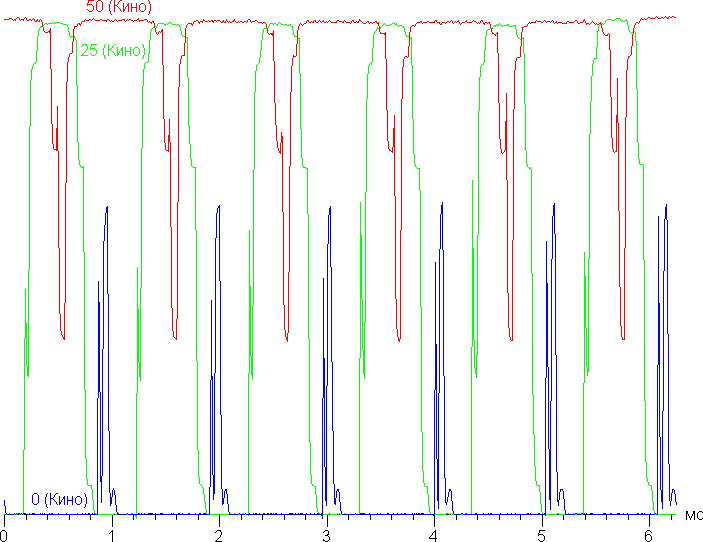 Однако, если включить режим Кино, то частота ШИМ возрастает до 960 Гц, что в совокупности с зональностью очень сильно снижает заметность мерцания — в обычных условиях его не видно. Ниже приведена зависимость яркости от времени для режима Кино.