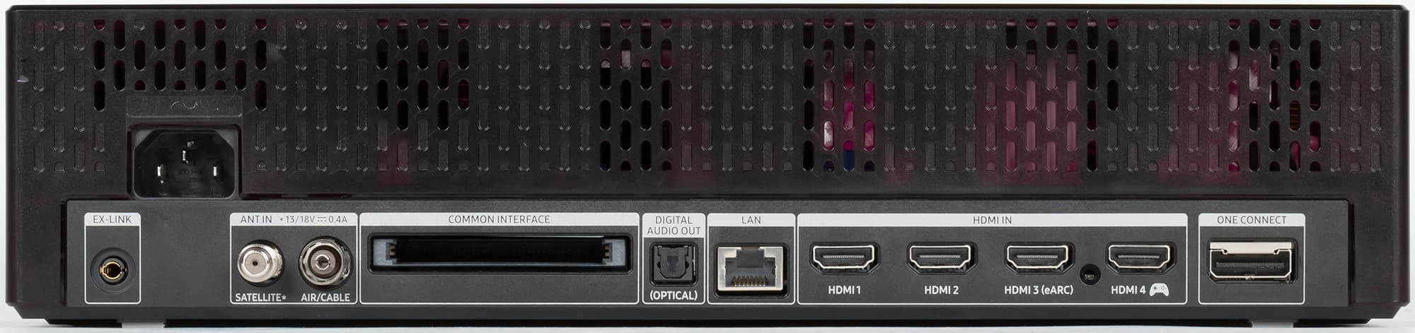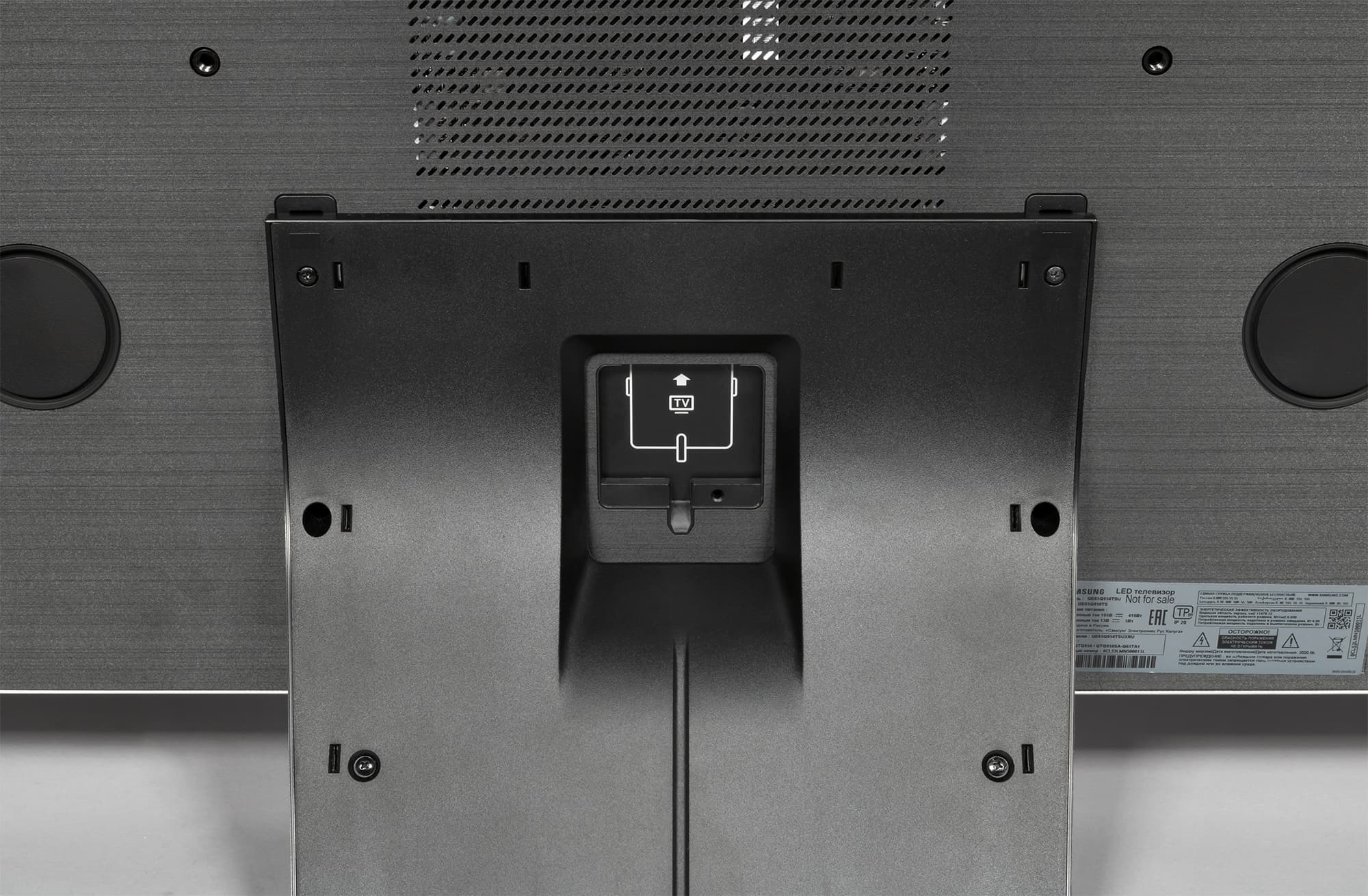 Разъем кабеля One Invisible Connection от модуля One Connect устанавливается в гнездо в неглубокой нише на задней панели и дополнительно может быть зафиксирован винтом.