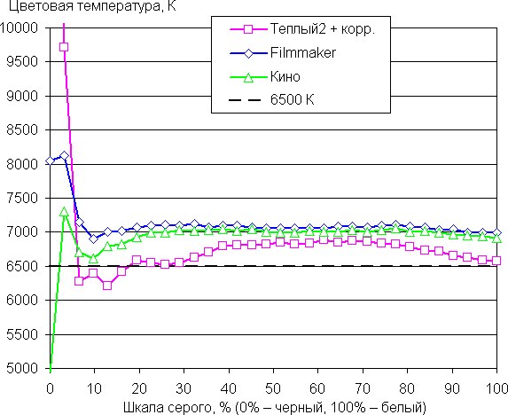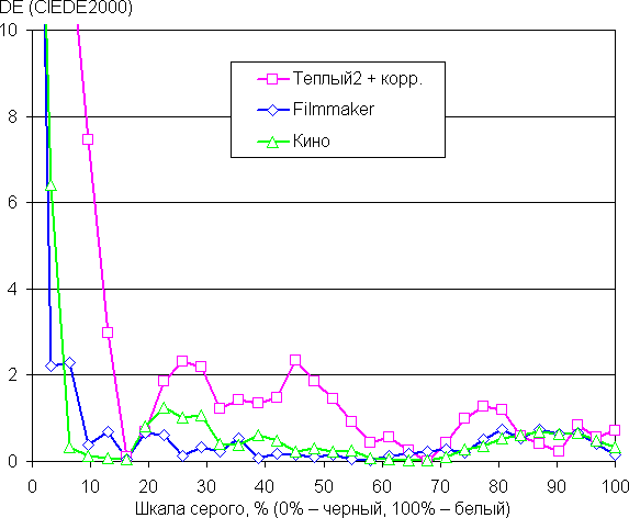 Самый близкий к черному диапазон можно не учитывать, так как в нем цветопередача не так важна, а погрешность измерения цветовых характеристик высокая. По факту заниматься коррекцией не нужно, достаточно выбрать профиль Filmmaker или Кино, так как в обоих цветовой баланс для бытового устройства отличный — цветовая температура достаточно близка к стандартным 6500 К, а ΔE на большей части шкалы серого меньше 2 единиц, при этом оба параметра мало изменяются от оттенка к оттенку на значимой части шкалы серого.