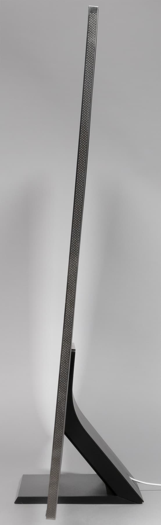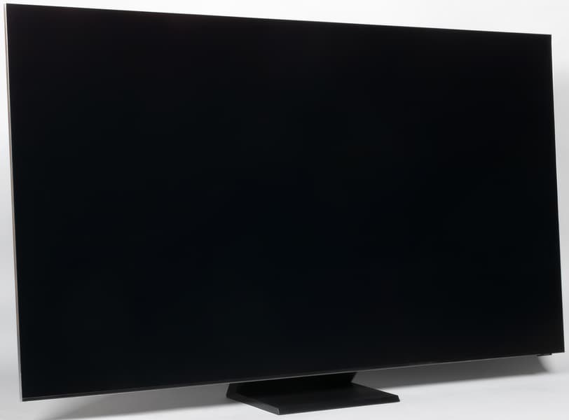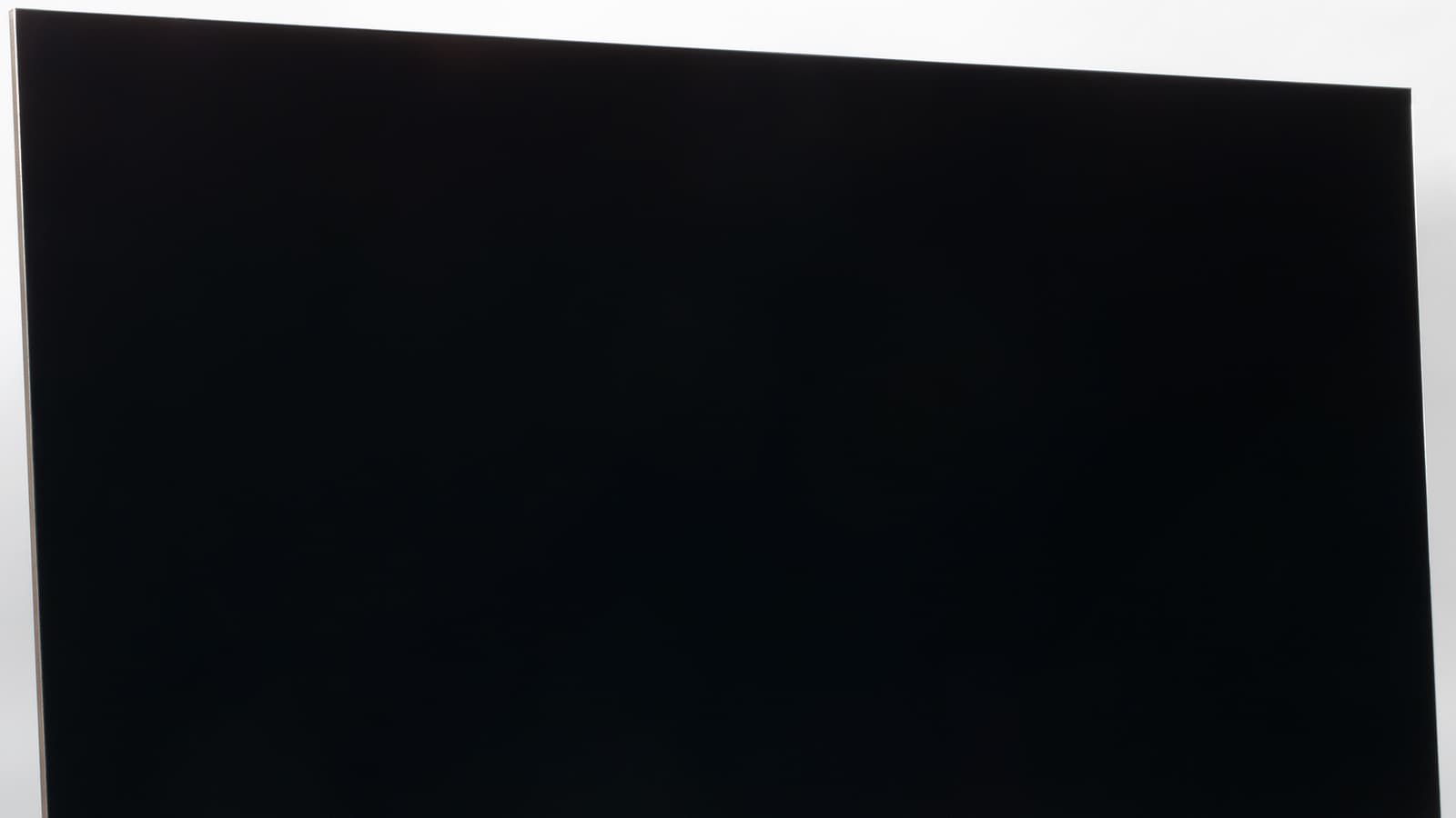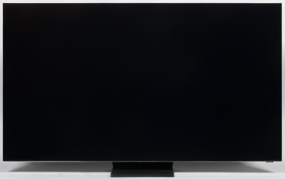 Дизайн строгий, декоративные элементы отсутствуют, доминирующий цвет — черный. Телевизор выглядит очень аккуратно как спереди, так и сзади. Экран не имеет рамок, в том смысле, что на его монолитной поверхности нет накладных выступающих вперед за плоскость элементов, есть только узкое обрамление из полосы, изготовленной из нержавеющей стали. Торец обрамления при некоторых условиях может отблескивать, но так как он очень узкий, то просмотру это практически не мешает. Выведя изображение на экран, можно увидеть, что между внешними границами экрана и собственно областью отображения есть узкие поля (от области отображения до внешних границ экрана сверху и с боков всего по 2,5 мм, а снизу — 8,5 мм). По самому низу плоскости экрана идет узкая (примерно 4,5 мм) полоска из прозрачного пластика. Внешняя поверхность матрицы глянцевая, но при перпендикулярном взгляде есть легкое матовое размытие отраженных объектов. Эта поверхность относительно устойчивая к повреждениям, так как даже после неоднократной очистки слегка влажной салфеткой на экране нет микроцарапин. Очень эффективный антибликовый фильтр снижает яркость отраженных объектов до такой степени, что зеркальность экрана просмотру не мешает, если только прямо напротив экрана нет очень ярких точечных источников света. При этом загрязнения не очень сильно влияют на антибликовые свойства.