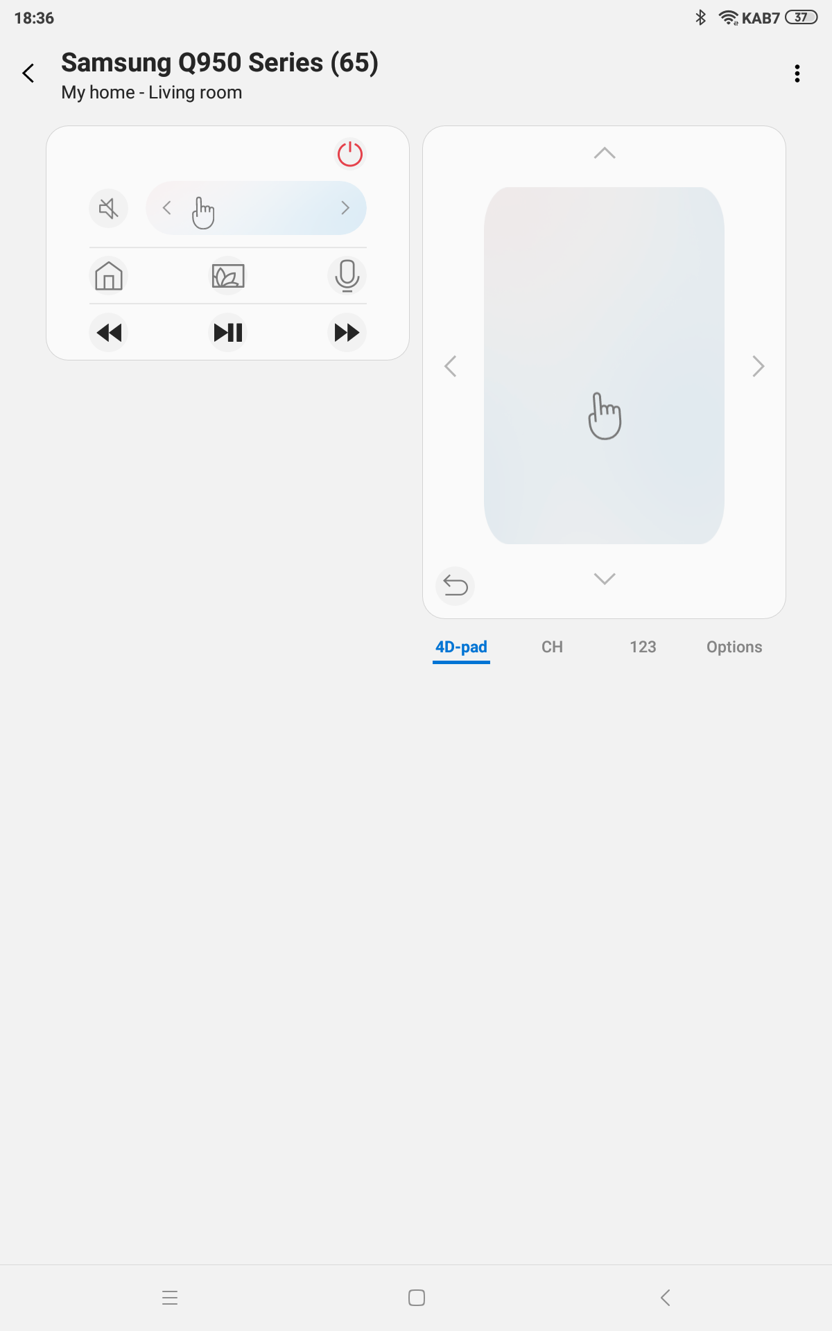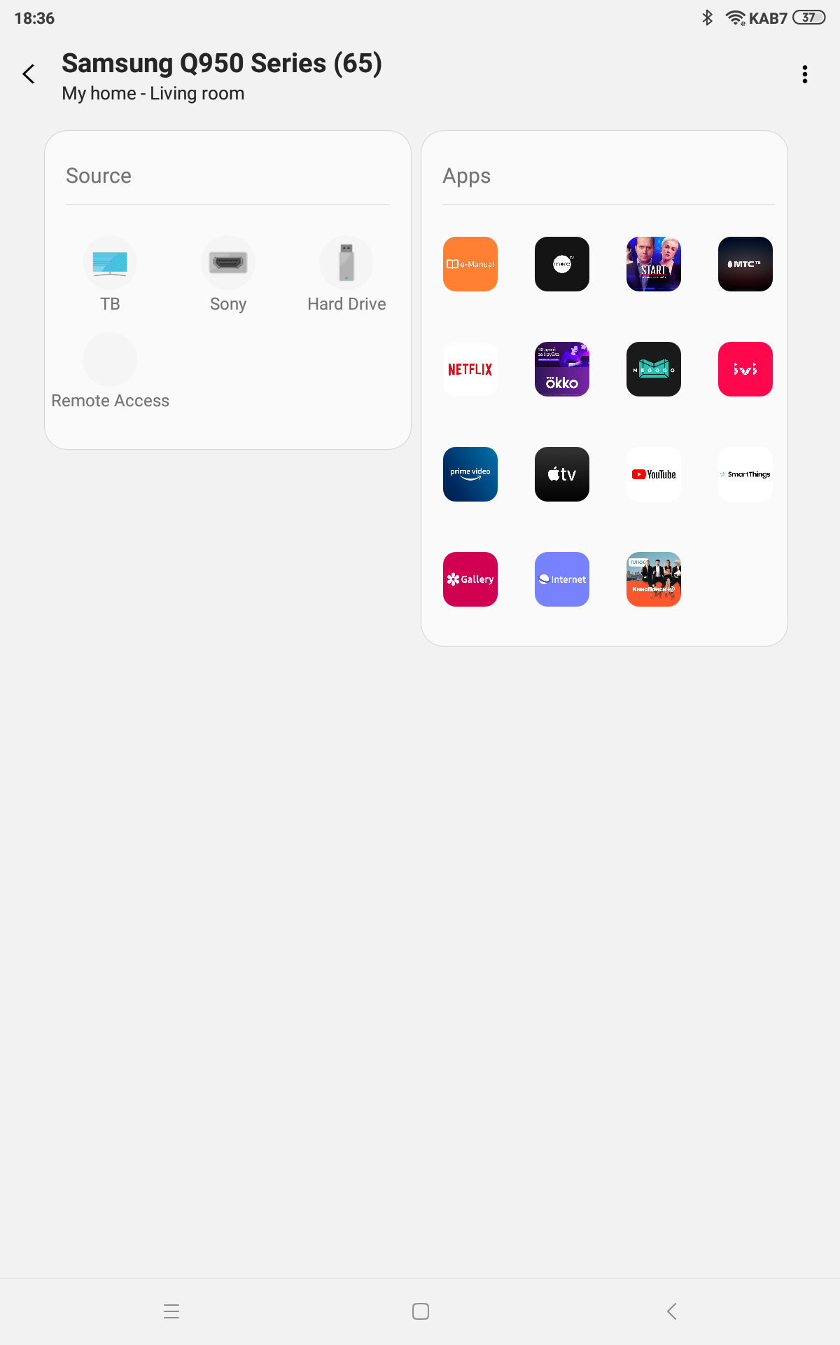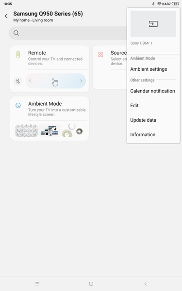 Телевизором можно управлять посредством мобильного устройства с помощью фирменного приложения SmartThings для Android и iOS. В данном ПО телевизор представляется как одним из устройств «умного дома», входящих в экосистему SmartThings. Для доступа к устройствам SmartThings используется облачный сервис, поэтому телевизором можно управлять из любого места, где есть доступ к Сети, хотя в данном случае это не дает особых преимуществ. В ПО SmartThings в главном окне модуля работы с телевизором есть виртуальный пульт ДУ с кнопками и панелью координатного ввода, панель выбора входов (только подключенных) и приложений. Дополнительно с помощью SmartThings можно настраивать работу режима Ambient.
