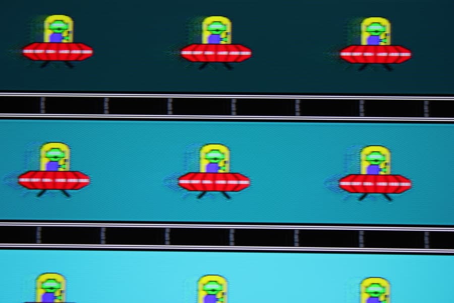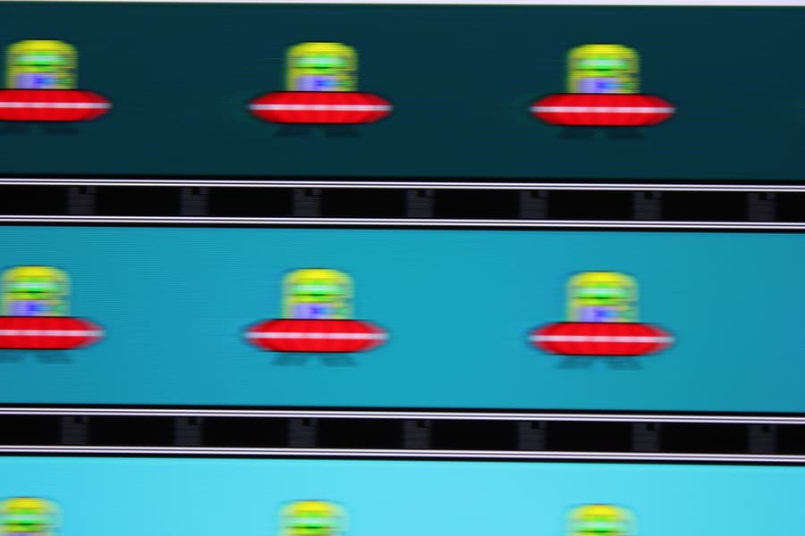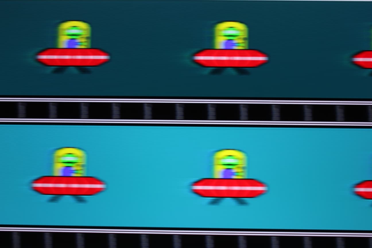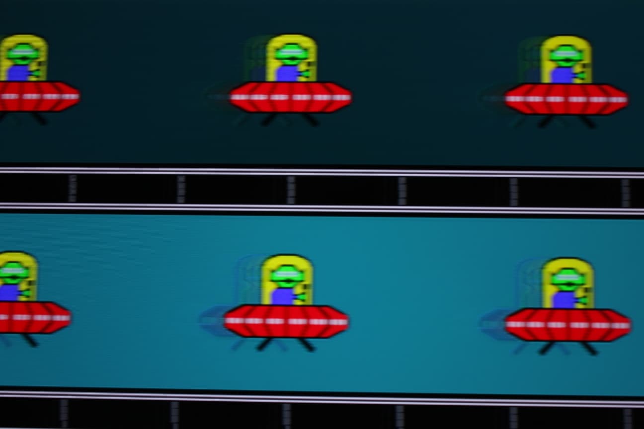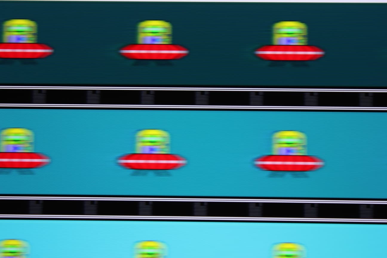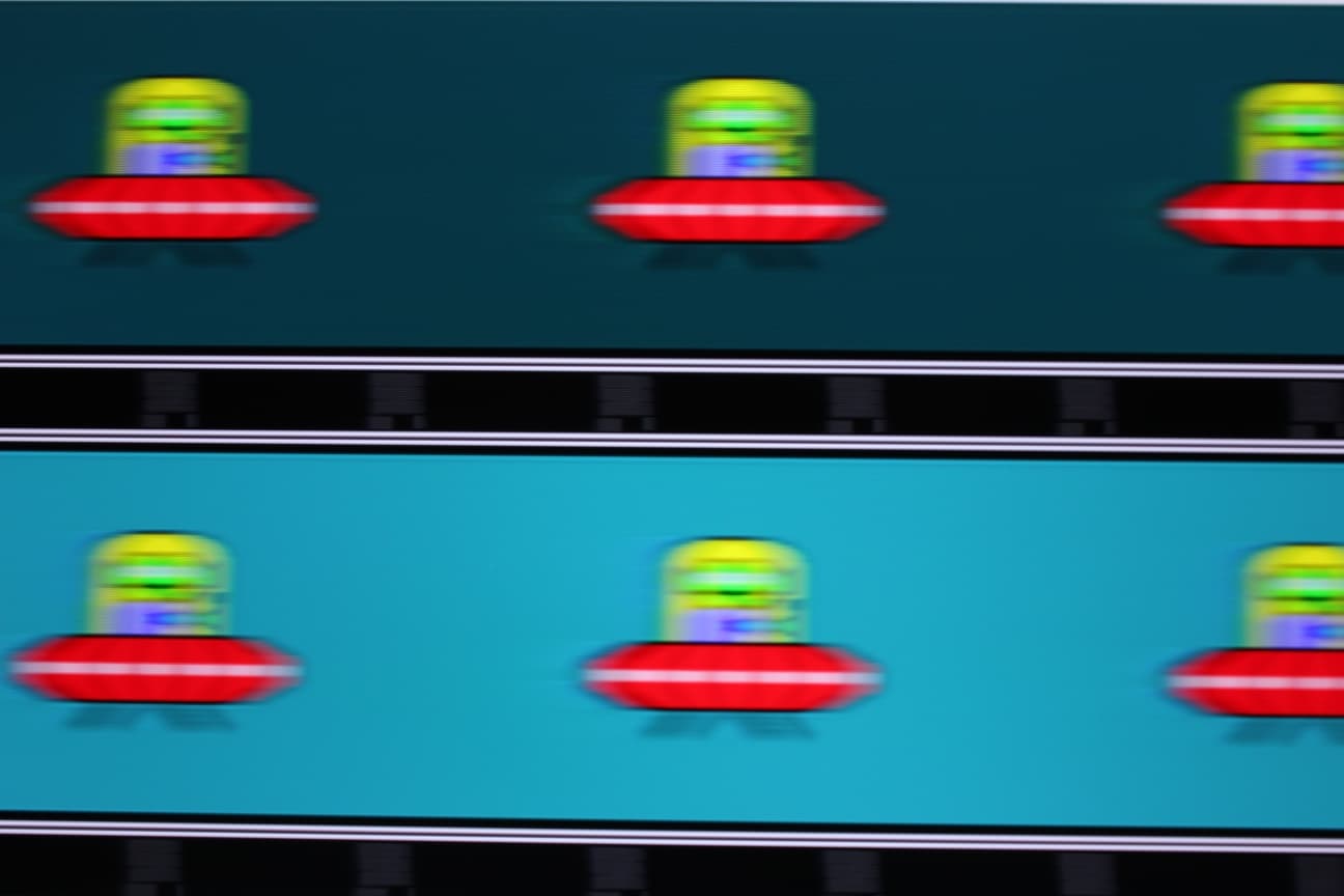 Видно, что при прочих равных условиях четкость изображения не зависит от разрешения (8К или 4К), в режиме с частотой обновления 120 Гц четкость немного выше, а включение режима ЧИL существенно повышает четкость, но и приводит к появлению неяркой тени позади летающей тарелки. С выключенным ЧИL артефакты, вызванные разгоном — светлая кайма на темном фоне, — несущественные.