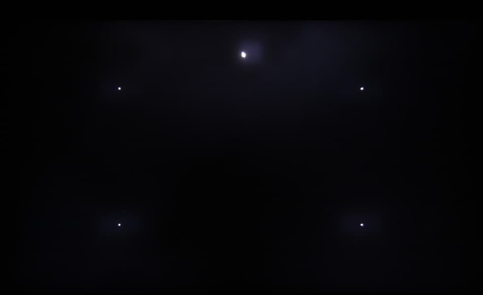 Нужно отметить, что, во-первых, телевизор нам достался не совсем новым, поэтому характер засветки мог измениться из-за неаккуратного обращения; во-вторых, без изменения параметров в сервисном меню пользователь такую картину никогда не увидит, так как будет работать глобальное и локальное затемнение. Контрастность в абсолютном значении довольно высокая, но для данного типа матриц мы ожидали получить значение порядка 3000:1. Видимо, специальный слой, расширяющий углы обзора, снижает контрастность. Так как светодиодов подсветки во много раз меньше, чем пикселей в матрице, то каждый светодиод освещает область из нескольких тысяч пикселей. Из-за этого на некоторых типах изображений могут быть артефакты в виде локальной засветки вокруг или около ярких объектов. Например, в случае тестового изображения с белыми точками и курсором мыши: