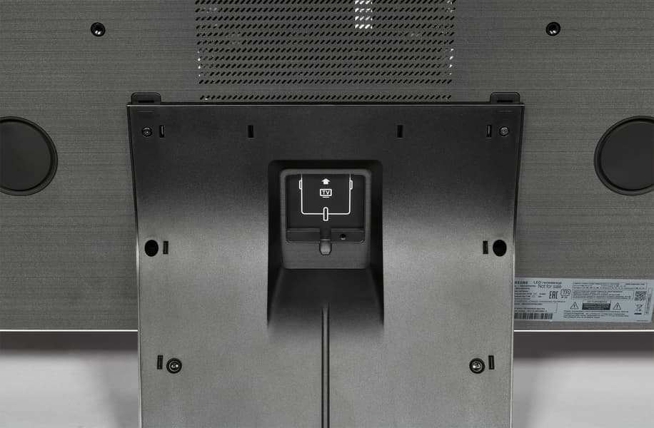Несмотря на большую диагональ, телевизор оснащен центральной подставкой, что позволяет устанавливать телевизор на не очень широкие тумбы. Подставка состоит из двух частей — основания и стойки. Несущие металлические элементы подставки прикрывают декоративные кожухи из черного пластика с матовой поверхностью. Снизу на основание наклеены резиновые противоскользящие накладки.