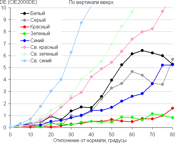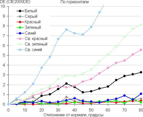 Для количественной характеристики изменения цветопередачи мы провели колориметрические измерения для белого, серого (127, 127, 127), красного, зеленого и синего, а также светло-красного, светло-зеленого и светло-синего полей во весь экран с использованием установки, подобной той, что применялась в предыдущем тесте. Измерения проводились в диапазоне углов от 0° (датчик направлен перпендикулярно к экрану) до 80° с шагом в 5°. Полученные значения интенсивностей были пересчитаны в отклонение ΔE относительно замера каждого поля при перпендикулярном положении датчика относительно экрана. Результаты представлены ниже: