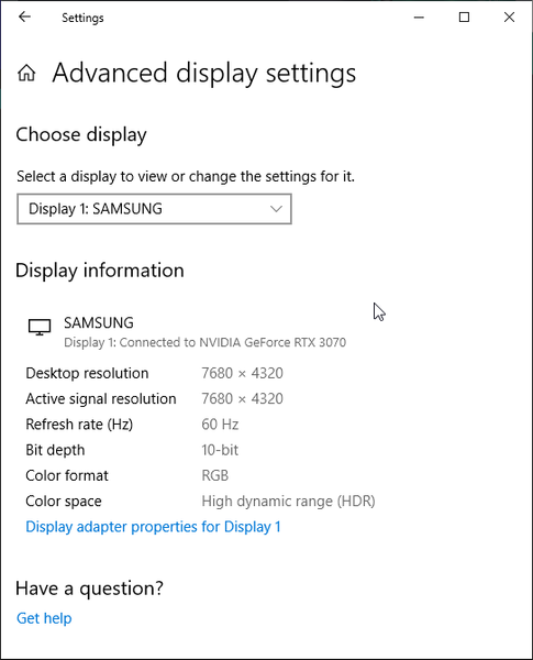 Под Windows 10 вывод в режиме HDR на данный телевизор возможен при выборе соответствующих опций в настройках дисплея. Даже в разрешении 8К и 60 Гц вывод идет в режиме 10 бит на цвет: