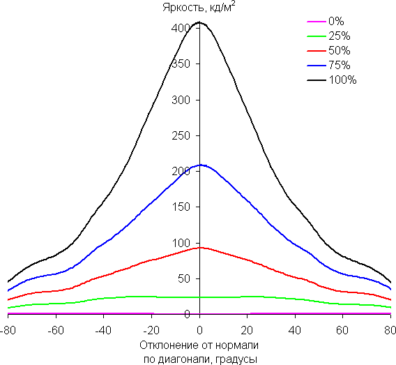 Чтобы выяснить, как меняется яркость экрана при отклонении от перпендикуляра к экрану, мы провели серию измерений яркости черного, белого и оттенков серого в центре экрана в широком диапазоне углов, отклоняя ось датчика в вертикальном, горизонтальном и диагональном направлениях.