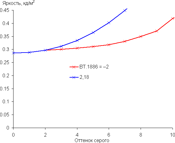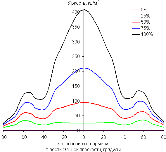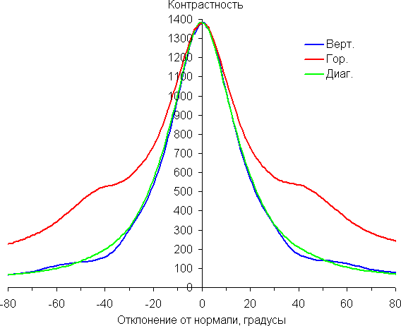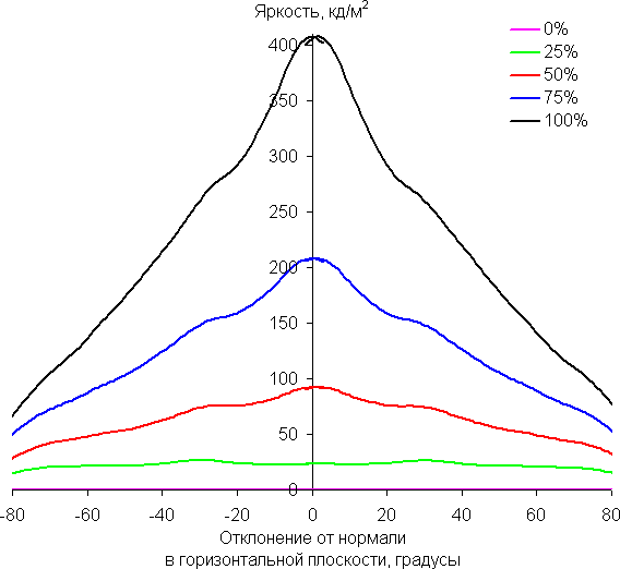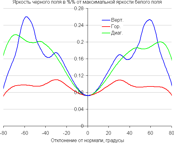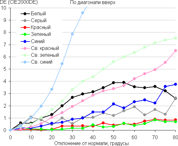 В качестве реперной точки можно выбрать отклонение в 45°. Критерием сохранения правильности цветов можно считать значение ΔE меньше 3. Из графиков следует, что при взгляде под углом белый, серый и первичные цвета меняются несильно, но полутона (особенно светло-синий) могут существенно изменяться. В целом, устойчивость цветов к отклонению взгляда от перпендикуляра к экрану несколько выше, чем в случае типичной матрицы типа VA*. Видимо, волшебный слой и в этом случае оказывает положительное влияние.