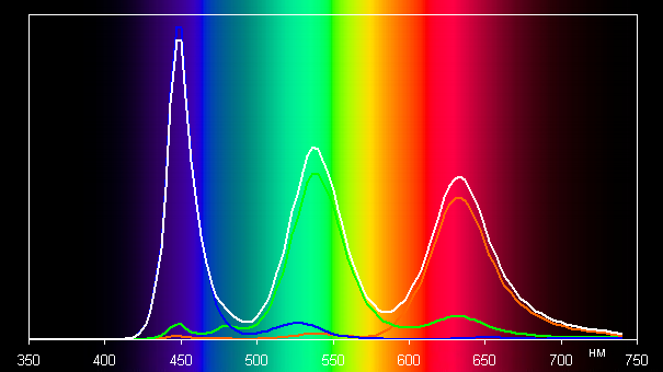 Ниже приведен спектр для белого поля (белая линия), наложенный на спектры красного, зеленого и синего полей (линии соответствующих цветов) для профиля Исходный: