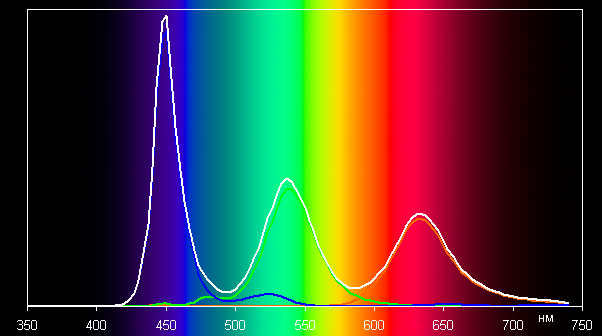 Видно, что спектры компонент хорошо разделены, что и позволяет получить широкий цветовой охват. Перекрестное подмешивание незначительное, то есть цветовой охват в случае профиля Исходный близок к оригинальному охвату экрана ТВ. В случае режима с цветовым пространством sRGB выполняется существенное программное перекрестное подмешивание первичных цветов друг к другу.