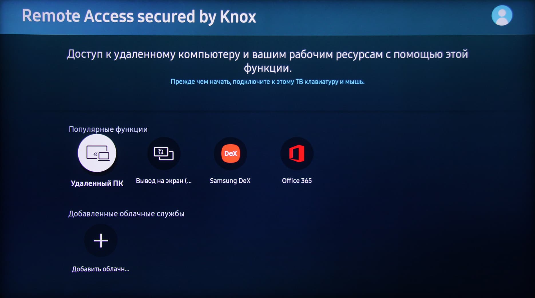 Нужно отметить, что в целом интерфейс хорошо оптимизирован для использования только комплектного пульта ДУ, то есть подключать клавиатуру и мышь, в общем-то, не обязательно, но они пригодятся еще в трех сетевых функциях: доступ к удаленному рабочему столу, подключение к мобильному устройству и работа в Office 365. Также есть функция вывода рабочего стола ПК на экране ТВ. Нами была подтверждена работоспособность доступа к удаленному рабочему столу (Remote Desktop Connection). В этом режиме плеер ТВ может воспроизводить мультимедийный контент из доступных общих папок ПК. Подключение к ТВ для вывода на него изображения рабочего стола (только по Wi-Fi, и видимо, в пределах одной сети), режим Samsung DeX и работу в Office 365 мы не проверяли.