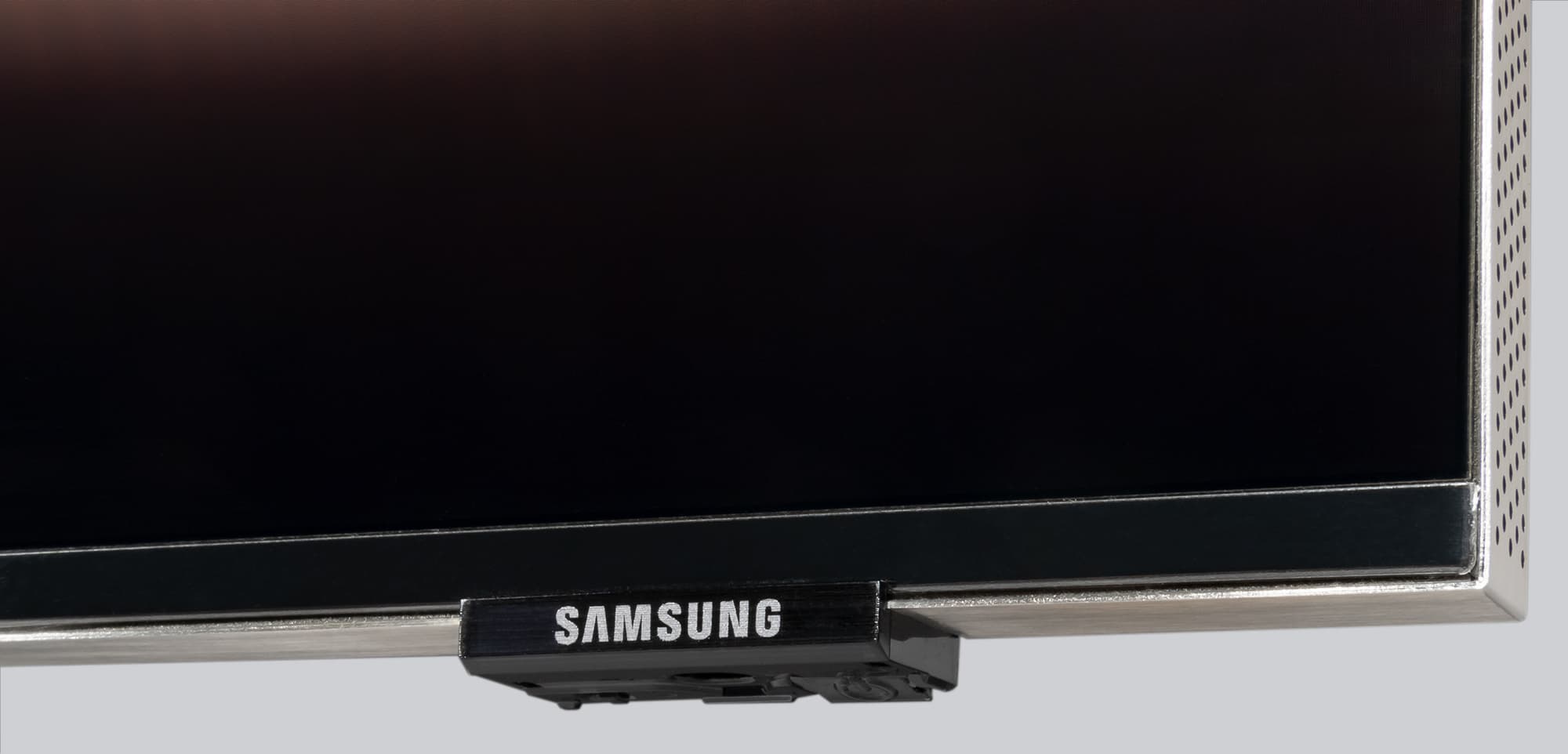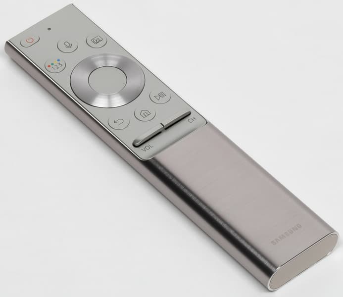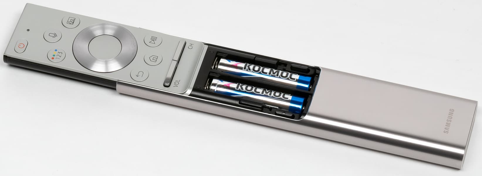 Пульт имеет типичную для топовых ТВ Samsung конструкцию. Пульт небольшой (158×36×13 мм) и нетяжелый (89 г с элементами питания). Нажав на кнопку снизу, можно сдвинуть назад алюминиевый кожух. При этом сверху открывается доступ к отсеку с элементами питания.