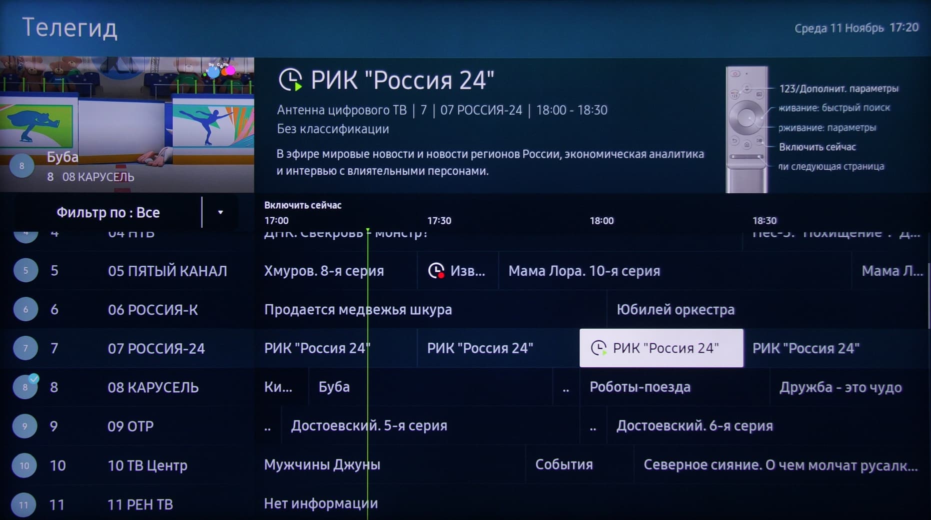 Есть хорошая поддержка электронной программы передач (если она передается) — можно посмотреть, что именно идет на текущем и других каналах, запрограммировать просмотр или запись программы или сериала и т. д.