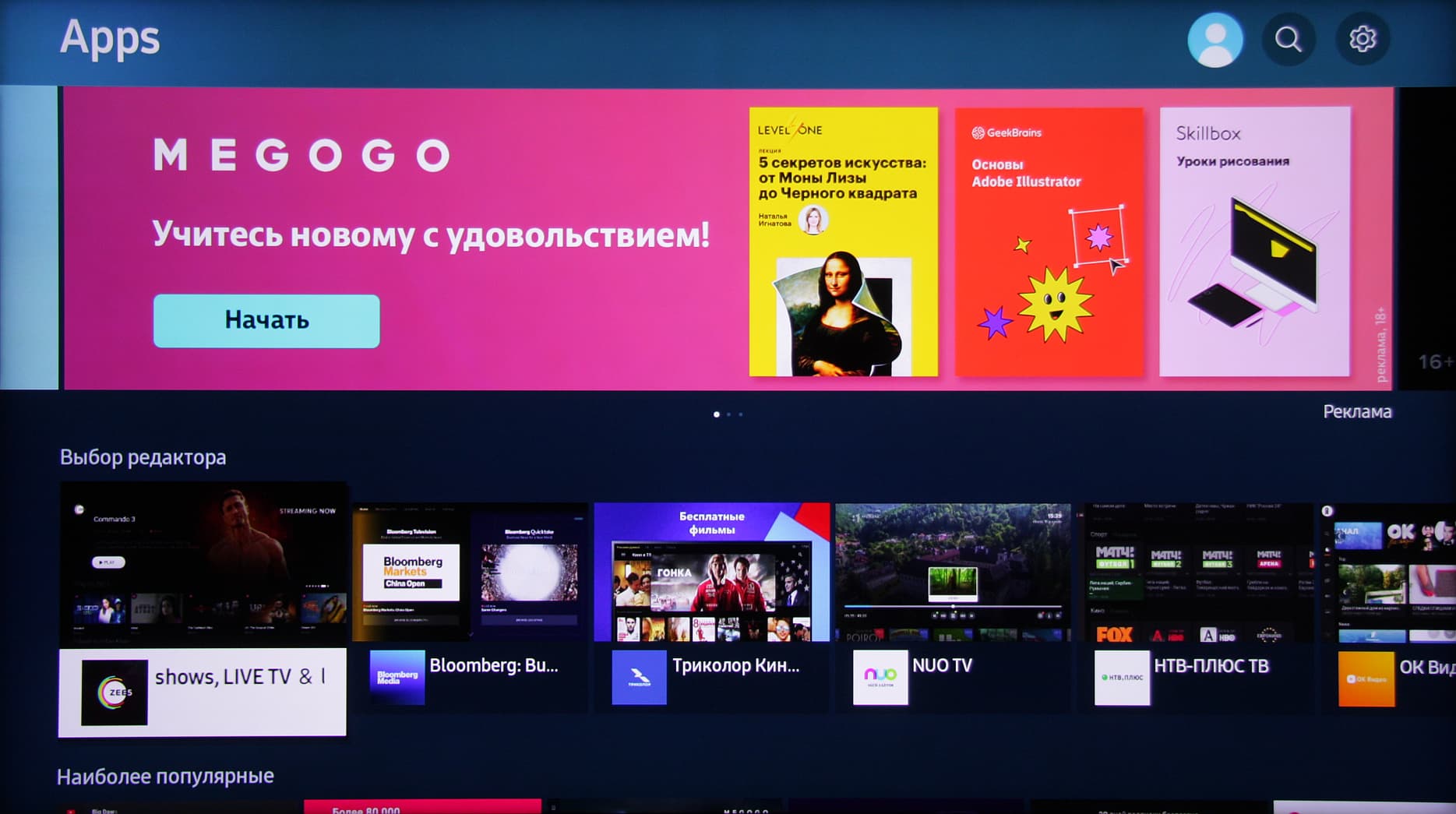 Программной платформой для этого ТВ служит открытая операционная система Tizen, основанная на ядре Linux. Заглавная страница интерфейса представляет собой две горизонтальные ленты. Верхняя — с контекстным содержимым, например, с подписанными миниатюрами быстрых настроек, входов и устройств или с рекомендованным контентом, соответствующим выбранному приложению. На нижней ленте размещены плитки выбора функций, источников, плитки-миниатюры установленных программ и т. д. Плитки на нижней ленте (именно плитки) можно переставлять и удалять, а также добавлять к ним плитки установленных приложений и плитки прямого выбора входов. Неприятным моментом является наличие не очень навязчивой рекламы в виде одной из плиток в нижнем ряду.