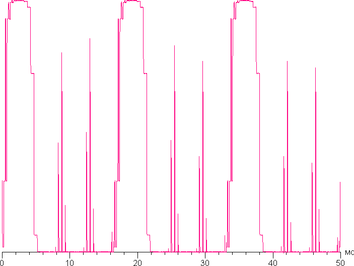 Есть функция, повышающая четкость объектов в движении (Четкое изображ. LED, далее ЧИL). Достигается это за счет модуляции яркости подсветки с основной частотой 60 Гц, яркость изображения при этом существенно снижается, а мерцание уже отчетливо видно, и оно очень утомляет, поэтому практической пользы этот режим не имеет. Зависимость яркости от времени для этого режима: