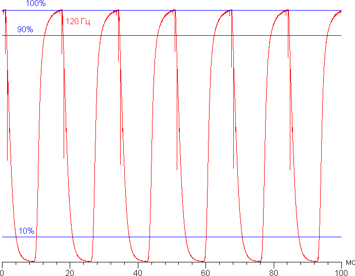 Скорости матрицы достаточно для полноценного вывода изображения с частотой 120 Гц. В подтверждение приведем зависимость яркости от времени при чередовании белого и черного поля (на части площади экрана) при 120 Гц кадровой частоты (график с подписью 120 Гц):