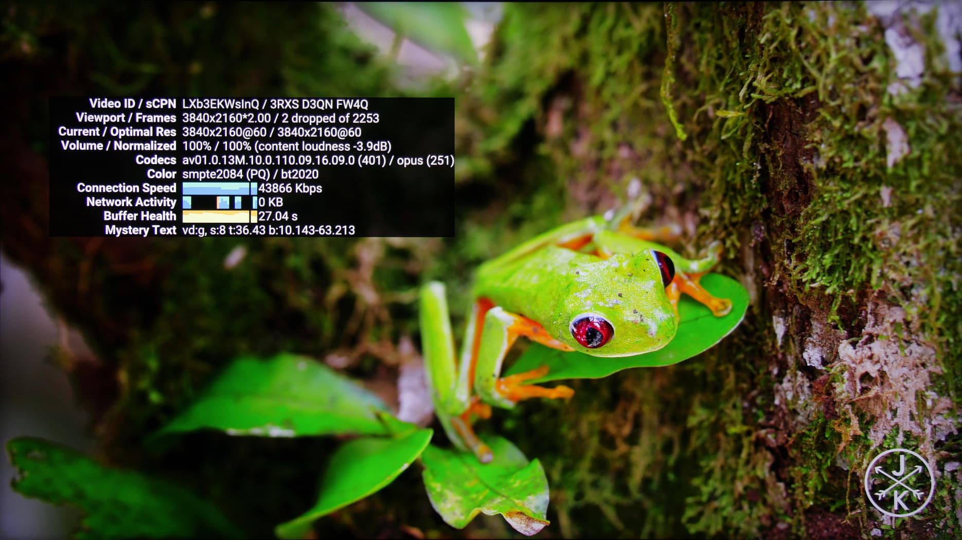 При всём при том, телевизор не воспроизводит из контейнеров AVI и MKV видео в кодеках DivX 3 и MPEG4 ASP, а файлы-контейнеры DivX и OGM в списке файлов вообще не отображаются. Впрочем, если ограничиться современными и более-менее распространенными форматами видеофайлов, то с очень большой вероятностью телевизор их воспроизведет. Поддерживается воспроизведение видеофайлов HDR (HDR10 и HLG; контейнеры WebM, MKV, MP4, TS; кодеки HEVC (H.265), AV1 и VP9), а в случае файлов с 10 бит на цвет согласно визуальной оценке градаций оттенков больше, чем у 8-битных файлов. Таким образом, в случае данного ТВ обеспечивается яркость до нескольких сотен кд/м², цветовой охват, близкий к DCI-P3, и 10 бит на цвет, то есть поддержка HDR реальная. В качестве примера источника HDR-контента можно привести предустановленное приложение YouTube, в котором удалось посмотреть видео в разрешении 4K с HDR при 60 кадр/с.
