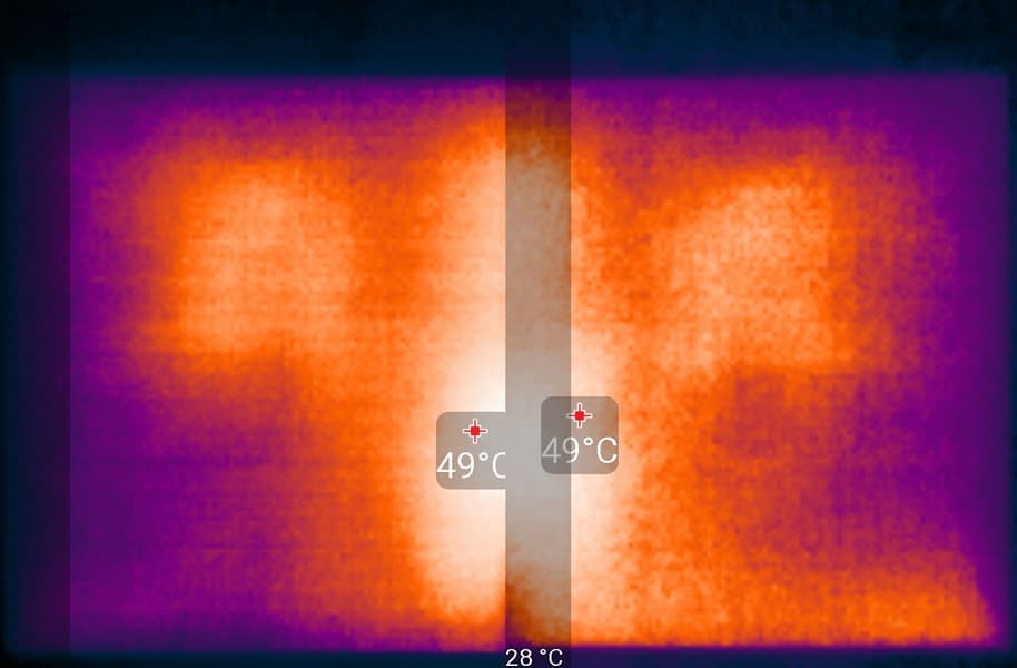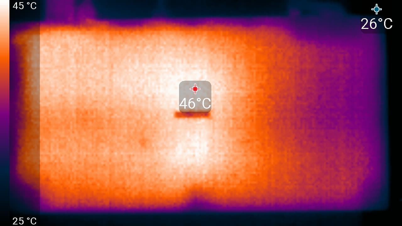 Нагрев телевизора можно оценить по изображению, составленному из двух снимков с ИК-камеры, полученных после долговременной работы на максимальной яркости в помещении с температурой примерно 24 °C: