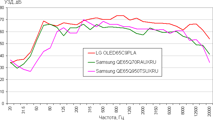 Сравним АЧХ этого ТВ с АЧХ двух других телевизоров (АЧХ получена с помощью шумомера при воспроизведении звукового файла с розовым шумом, замер УЗД в интервалах по 1/3 октав):