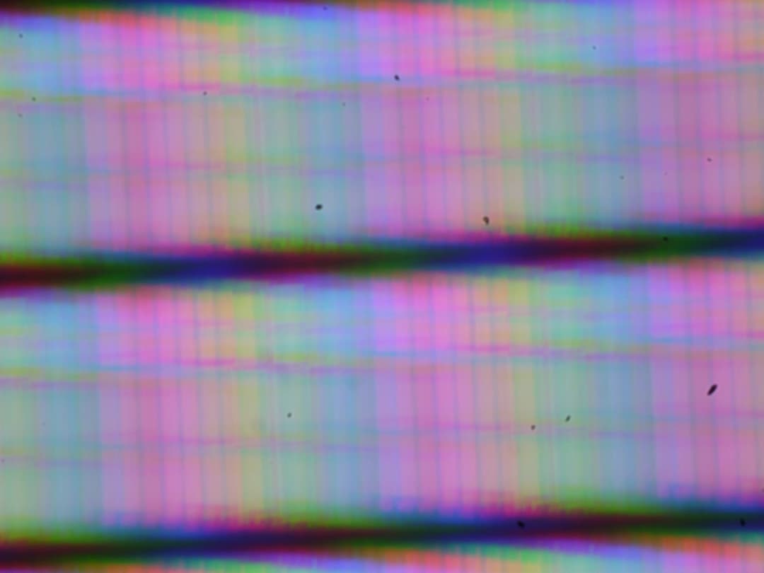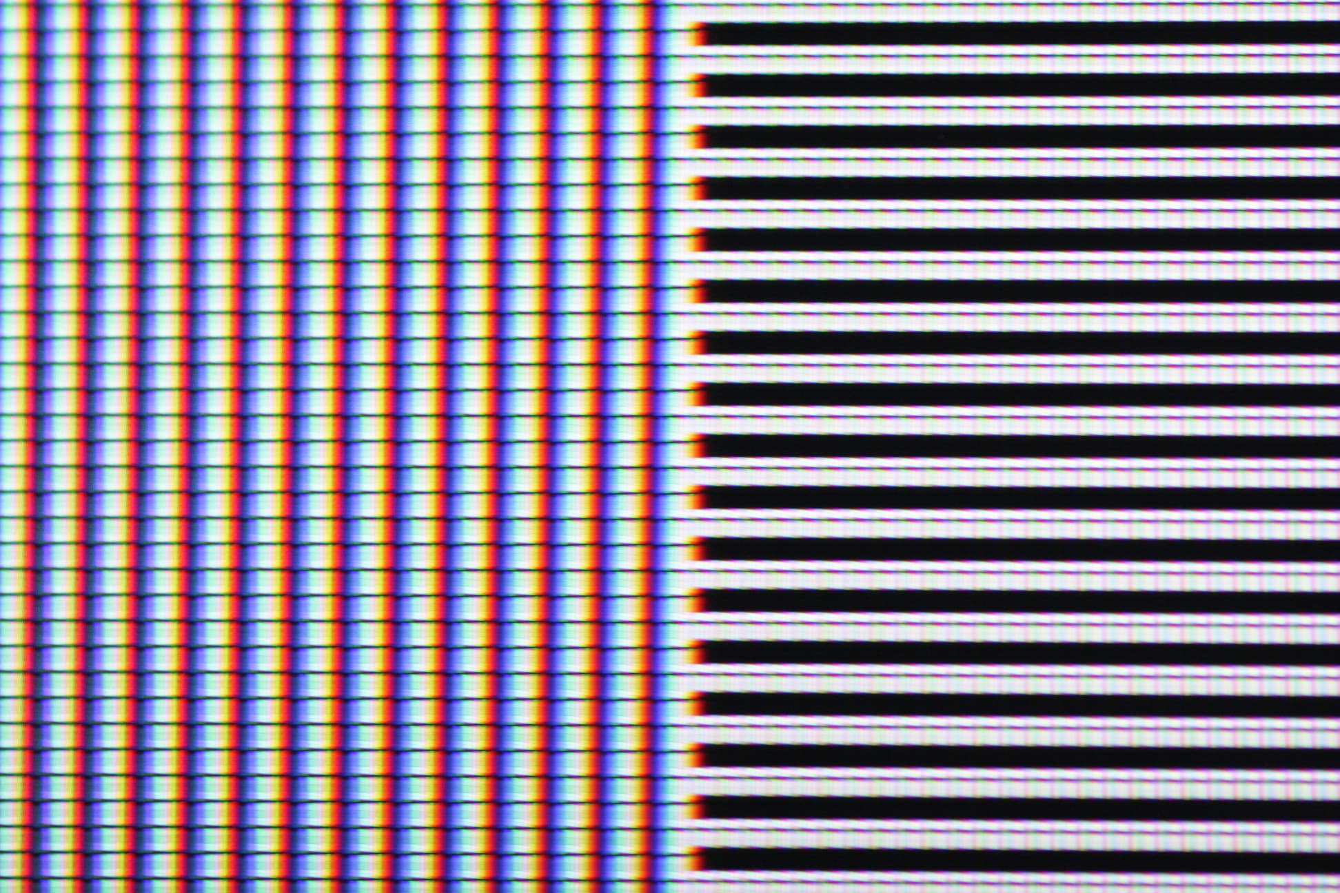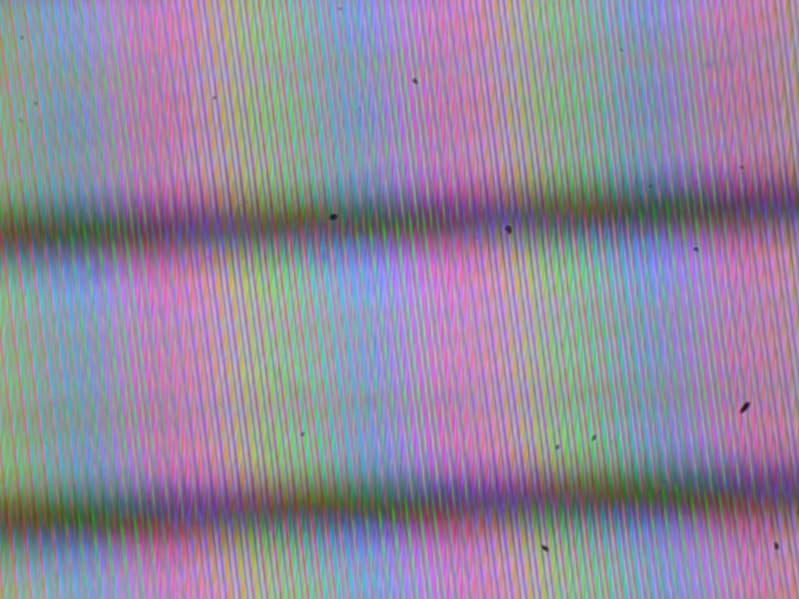 Изображения субпикселей трех цветов (красного, зеленого и синего) множатся и накладываются друг на друга преимущественно в горизонтальном направлении. Фокусировка на слоях выше выявила некую структуру в виде пересекающихся полосок, которые и преломляют свет от субпикселей.