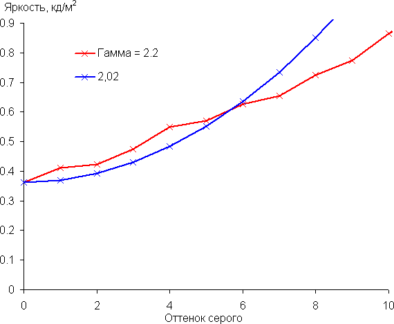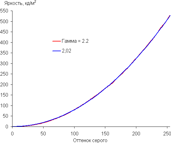 Аппроксимация полученной гамма-кривой дала показатель 2,02, что немного ниже стандартного значения 2,2, при этом реальная гамма-кривая мало отклоняется от аппроксимирующей степенной функции: