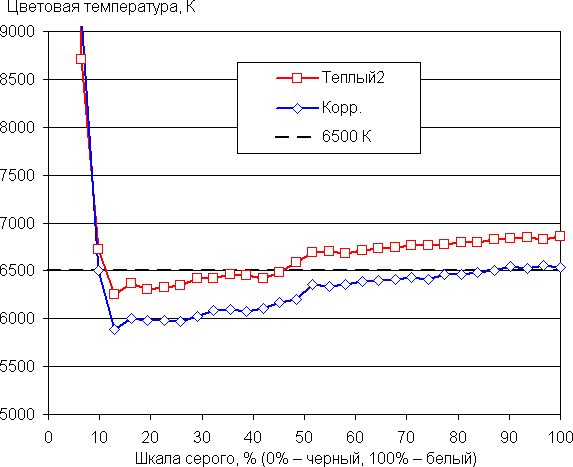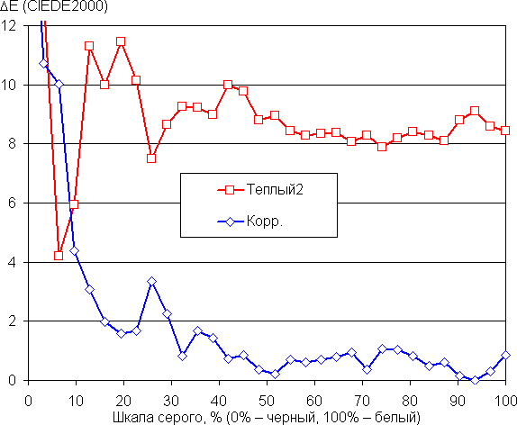 Графики ниже показывают цветовую температуру на различных участках шкалы серого и отклонение от спектра абсолютно черного тела (параметр ΔE) для профиля Стандартный при выборе варианта Теплый2 для настройки Оттенок и после небольшой коррекции цветового баланса настройками усиления трех основных цветов (значения 0, -16 и -7 для усиления красного, зеленого и синего цветов):