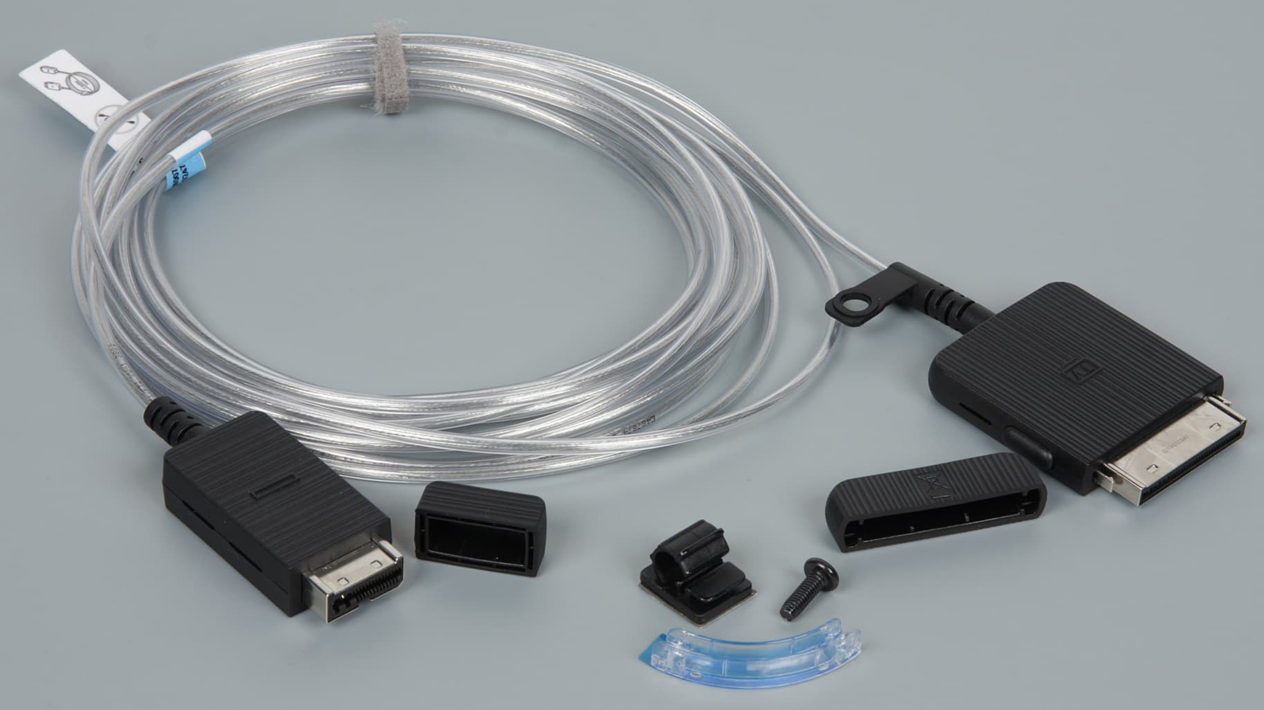 Вынос всех разъемов для подключения питания и внешних устройств — это, во-первых, удобно, так как телевизор можно поставить в нишу или повесить на стену, где доступ к разъемам на задней панели был бы затруднен, а модуль One Connect поместить в удобном для подключения периферии месте. Во-вторых, эстетично, так как телевизор по определению расположен на видном месте и ворох кабелей, подключенных к нему, смотрелся бы некрасиво, но с таким кабелем можно обеспечить малозаметное и аккуратное подключение самого телевизора, а все остальное подключить к модулю One Connect, расположив его в неприметном месте, например в тумбе под телевизором или вообще где-то в стороне. Возможно будет доступен и кабель One Invisible Connection, совместимый с данной моделью телевизора, длиной 15 м.