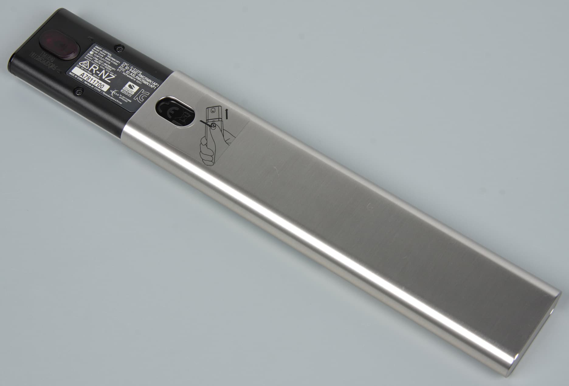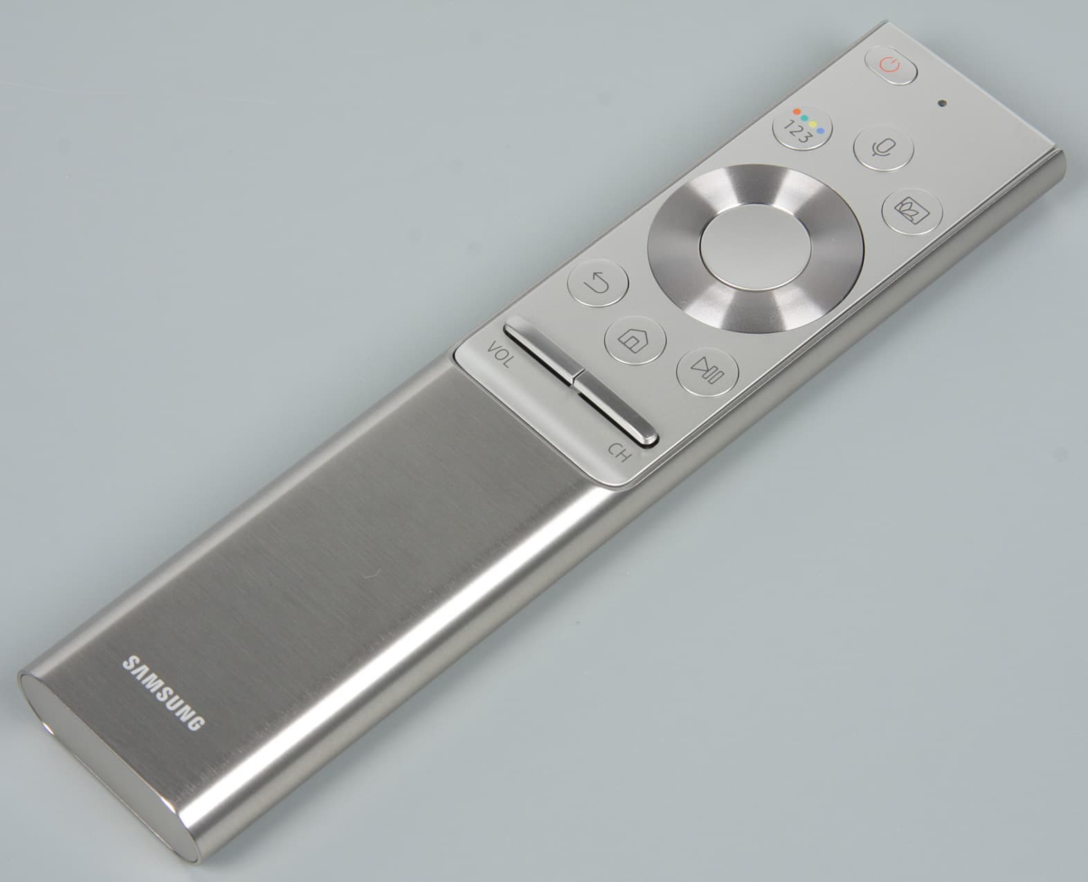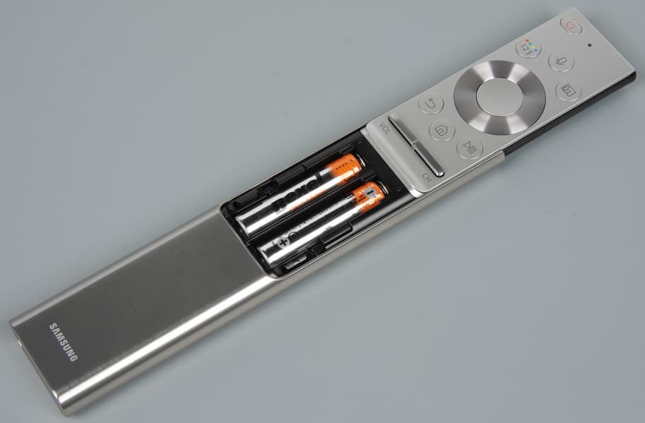 Пульт имеет уже традиционную для топовых ТВ Samsung конструкцию. Пульт небольшой (158×36×18 мм) и нетяжелый (91 г с элементами питания). Нажав на кнопку снизу, можно сдвинуть назад алюминиевый кожух.