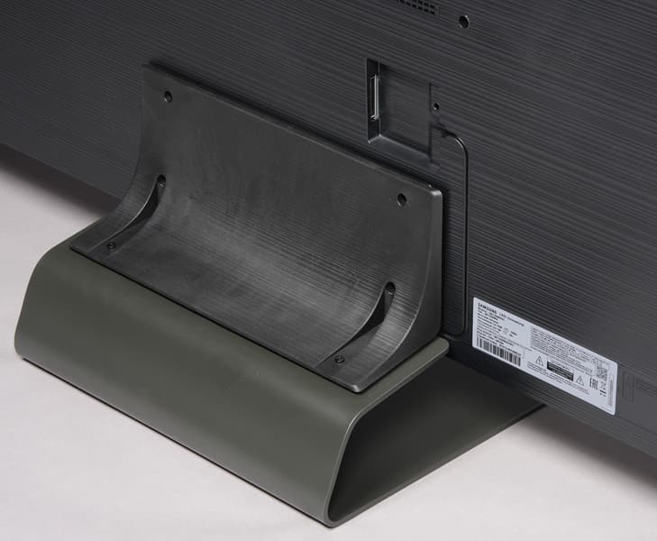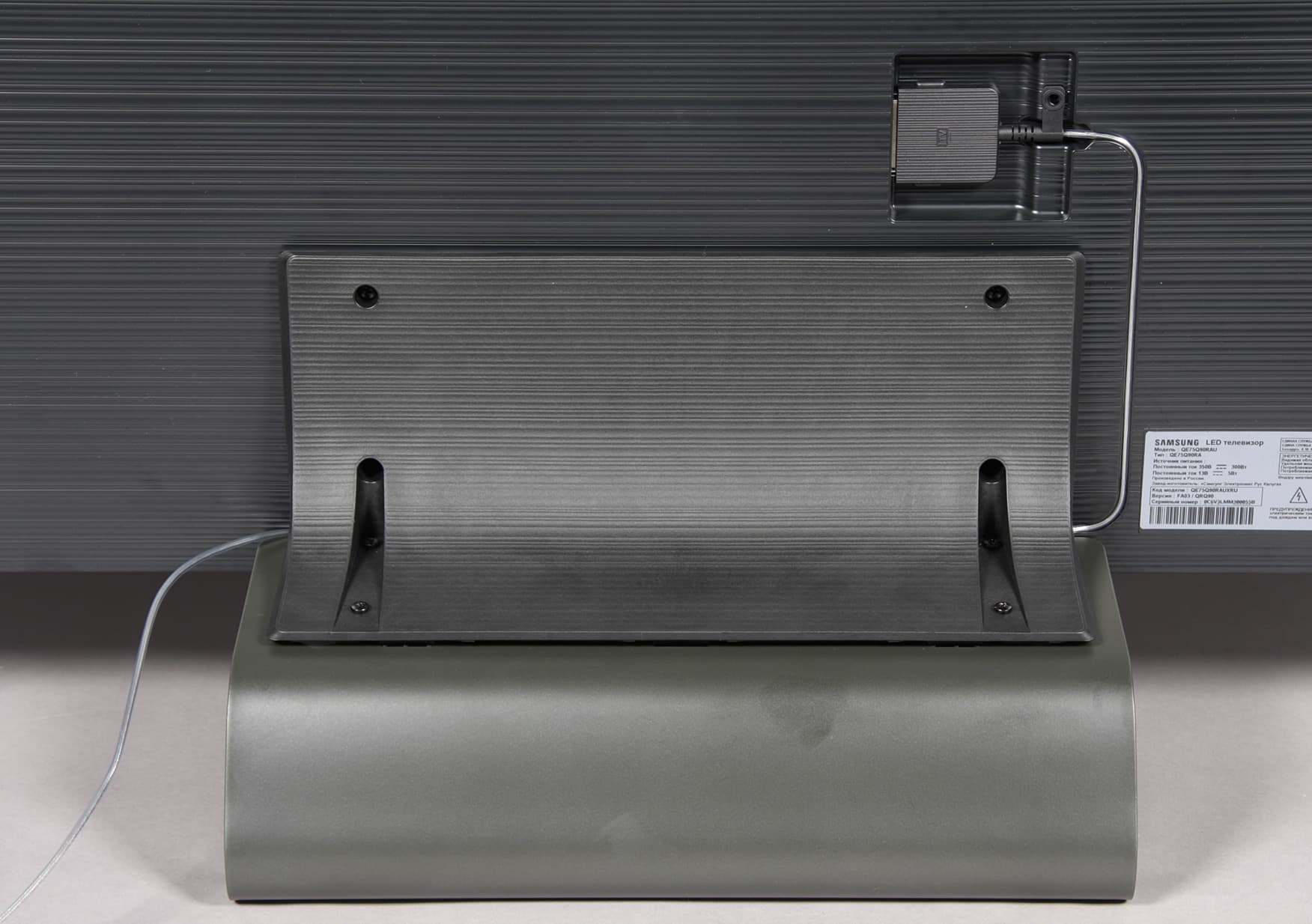 Несмотря на большую диагональ, телевизор оснащен центральной подставкой, что позволит устанавливать телевизор на не очень широкие тумбы. Подставка состоит из двух частей — U-образного основания и невысокой L-образной стойки. Основание подставки представляет собой изогнутую стальную пластину толщиной 5,5 мм, имеющую стойкое темно-темно-серое матовое покрытие. Снизу на основание наклеены резиновые квадратные противоскользящие накладки. К основанию подставки прикручивается стойка, также изготовленная из стали. Стойку прикрывает декоративный кожух из черного пластика с матовой поверхностью. Задняя поверхность кожуха имеет неглубокий рельеф в виде горизонтальных канавок. При сборке подставки сначала стойка прикручивается на сам телевизор, потом телевизор со стойкой устанавливается на основание и прикручивается к нему. Вдвоем все это сделать относительно просто, несмотря на очень большой размер и не малый вес телевизора.